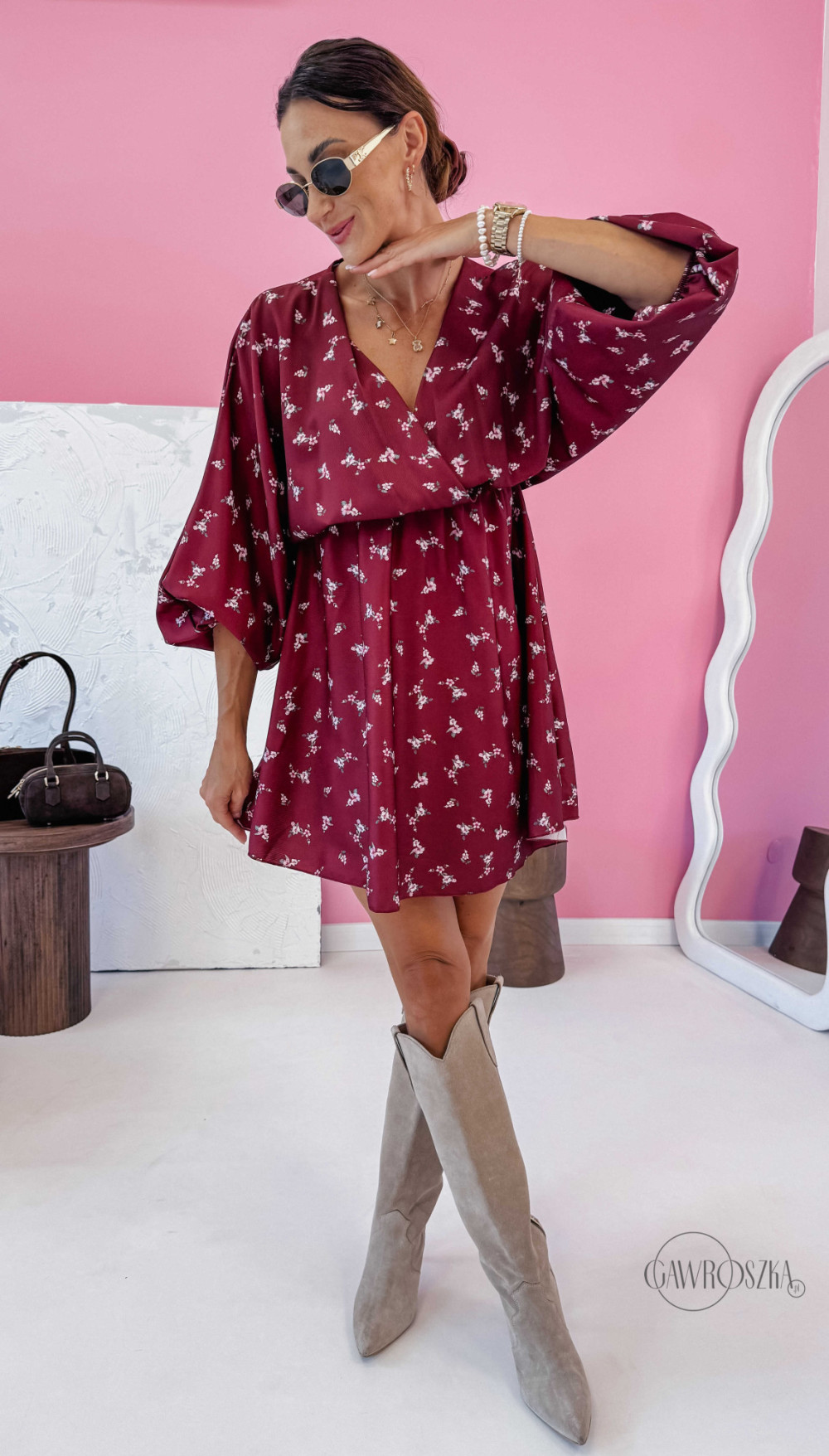 Sukienka ala kimono - bordowa w drobne kwiatuszki
