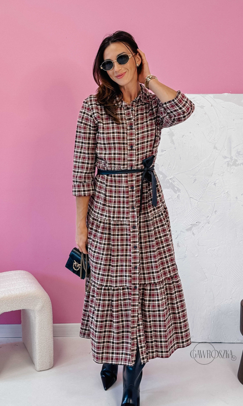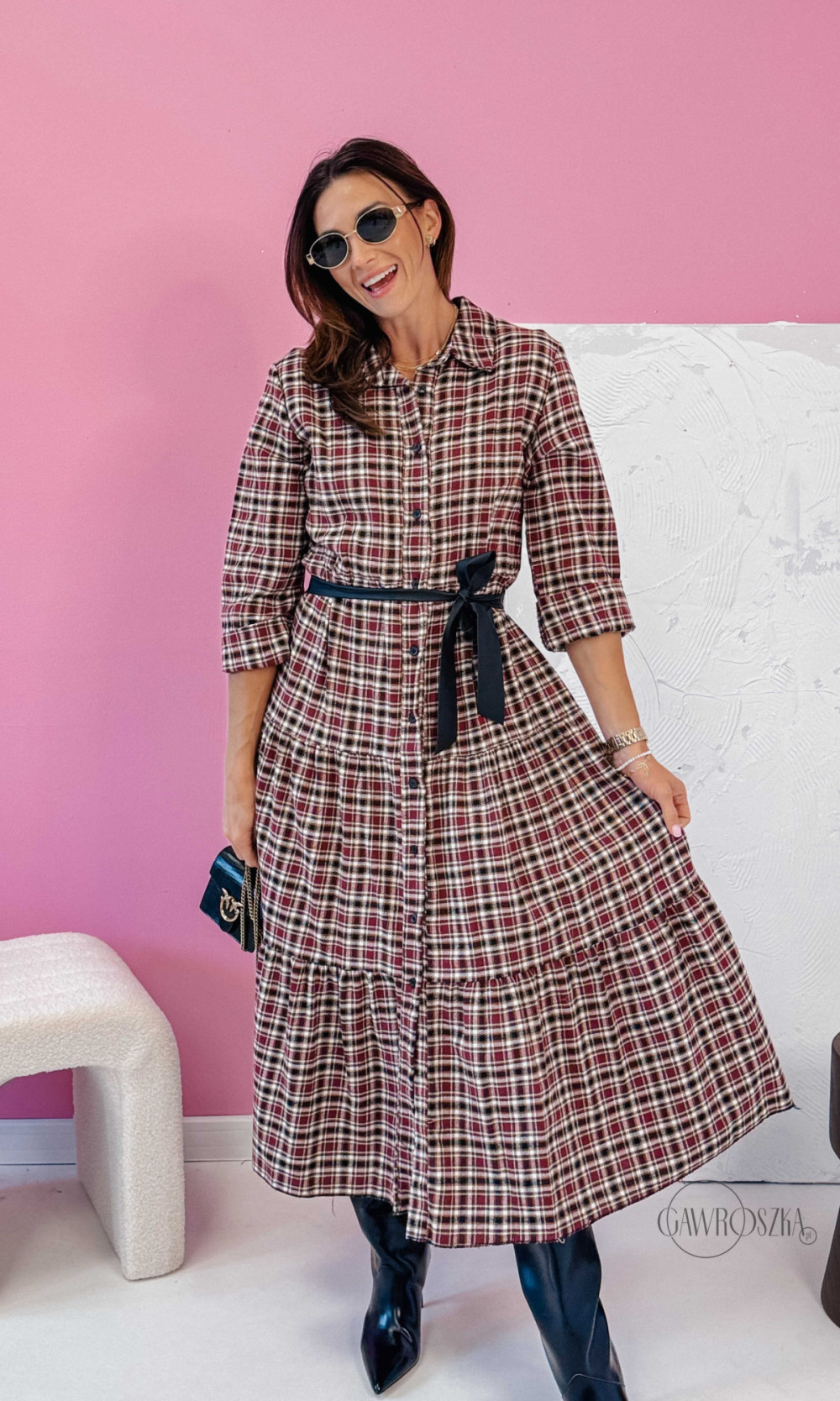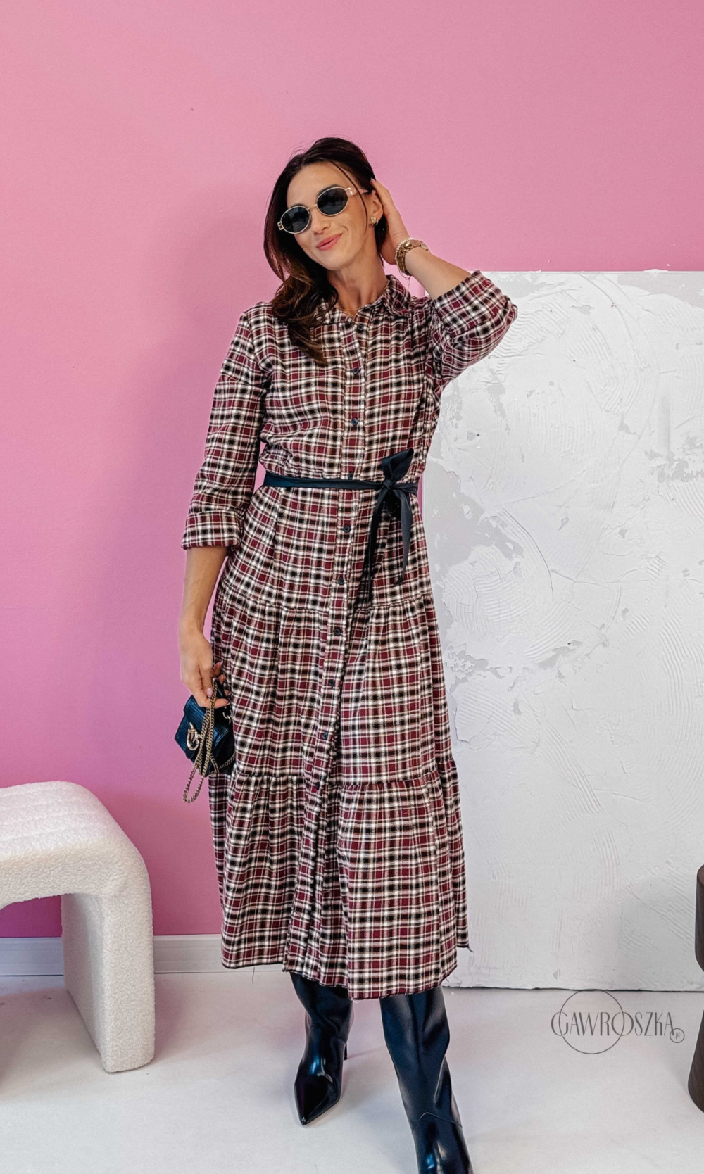 Flanelowa szmizjerka z przwiązaniem - biało-bordowa krateczka