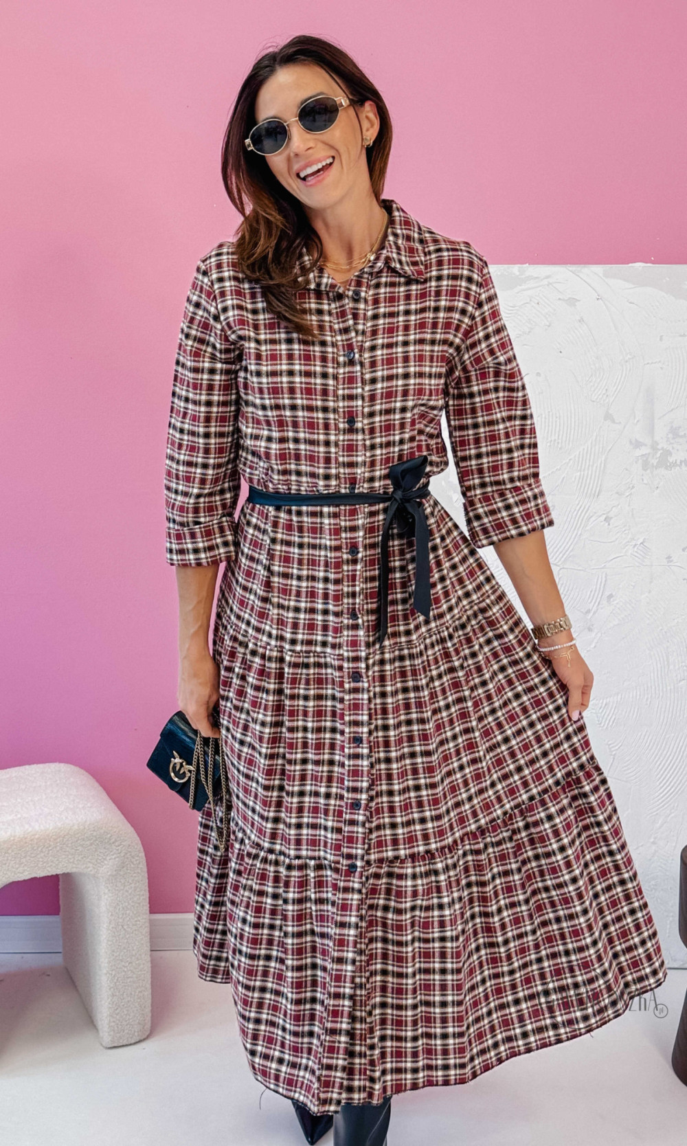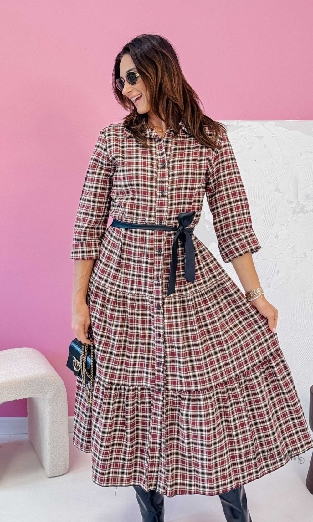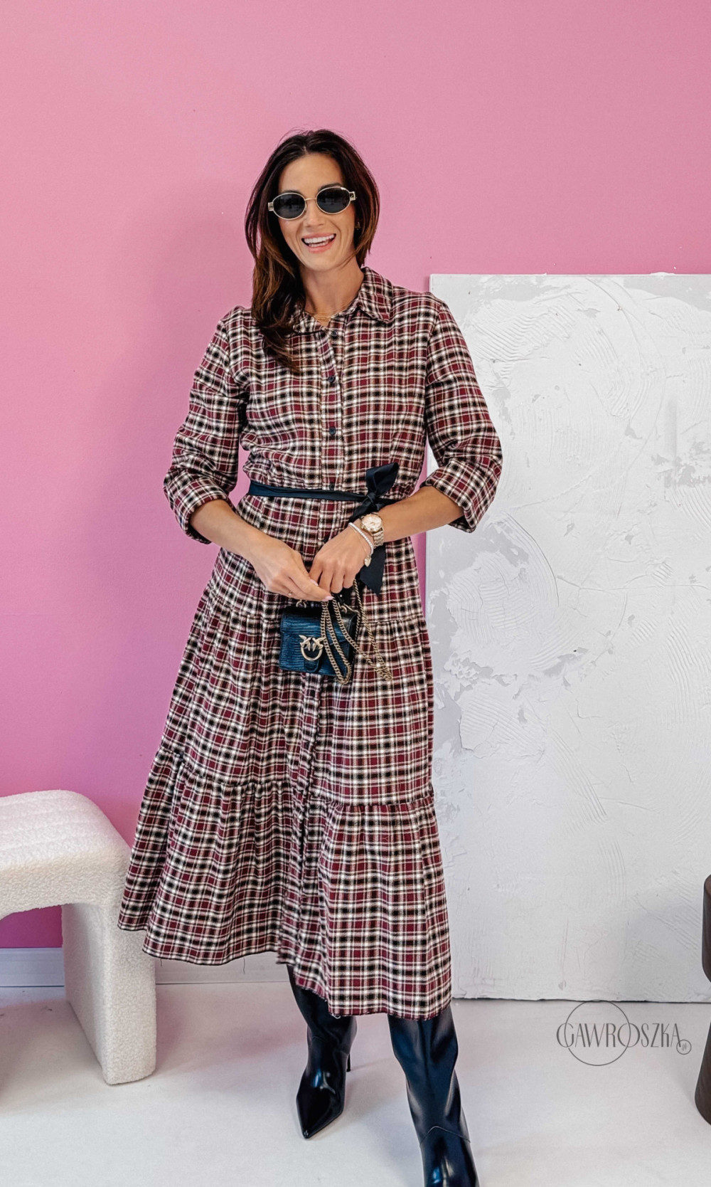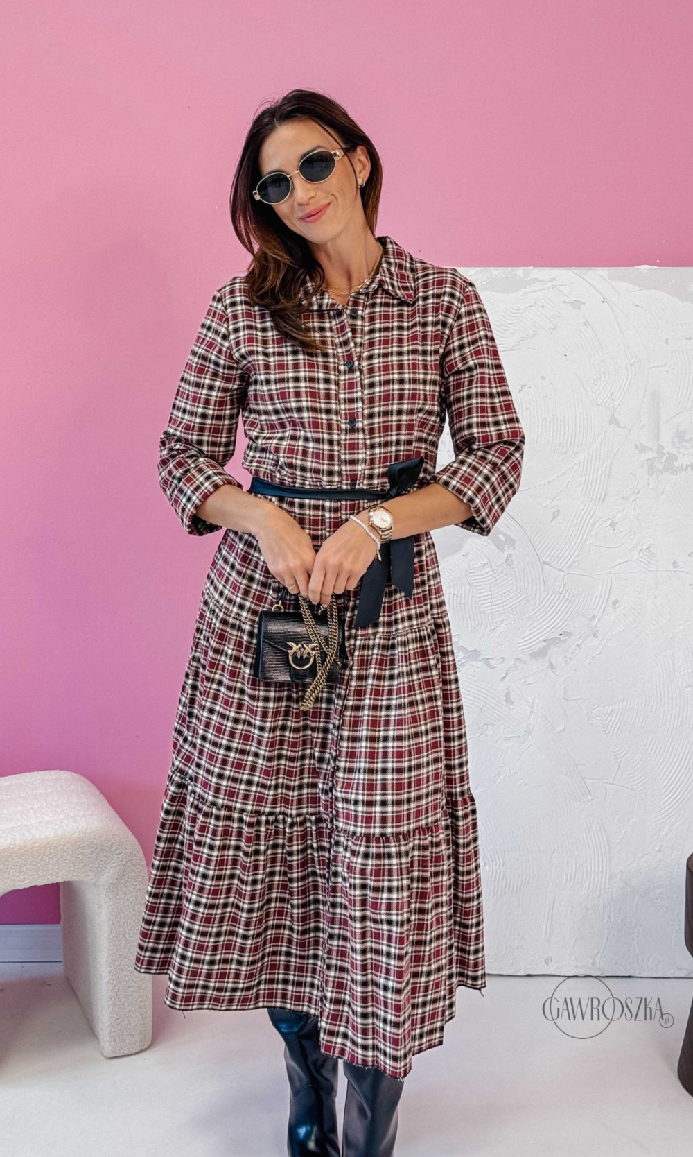 Flanelowa szmizjerka z przwiązaniem - biało-bordowa krateczka