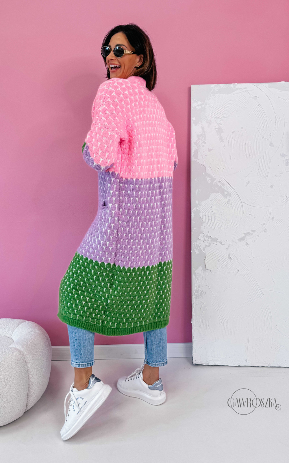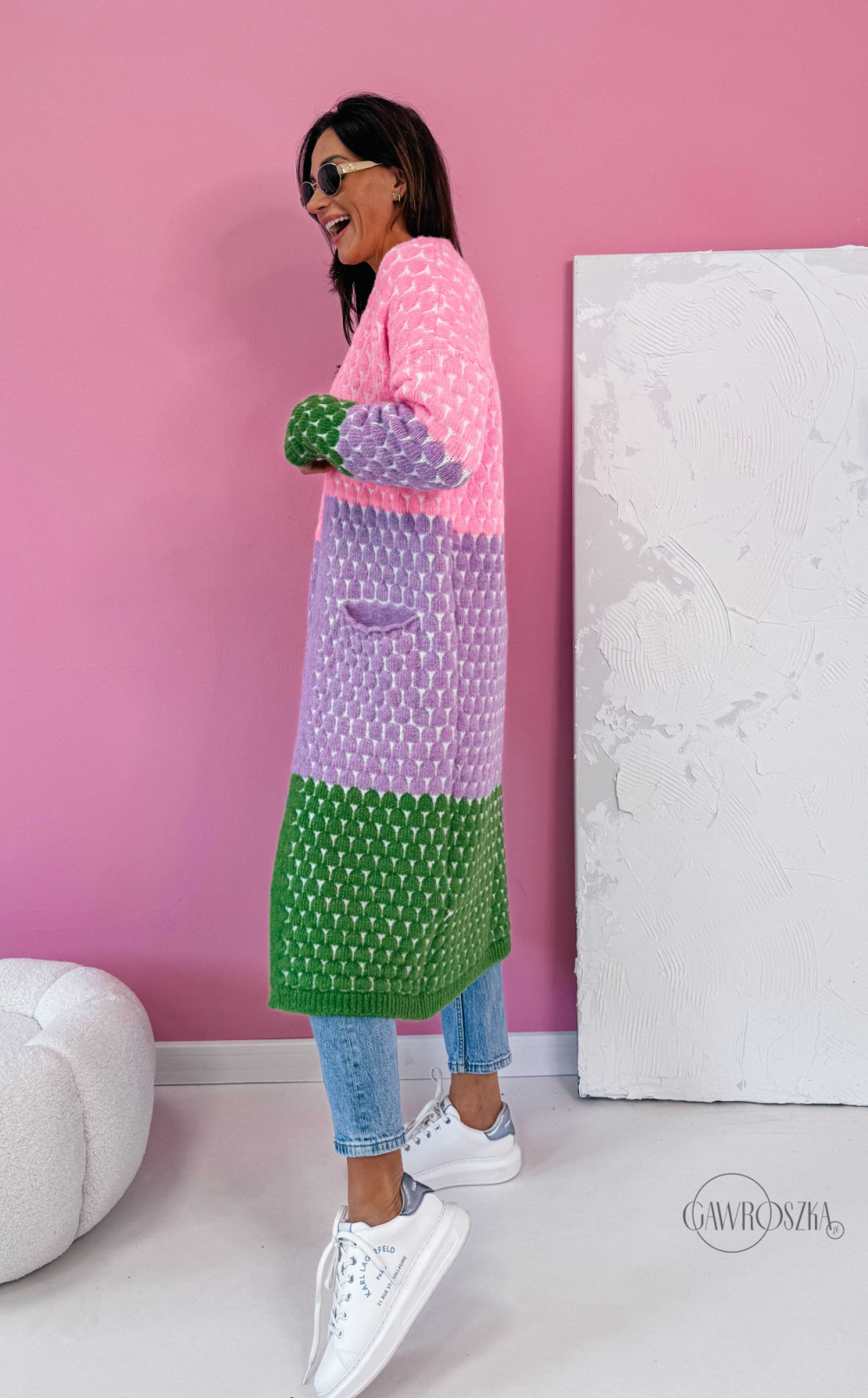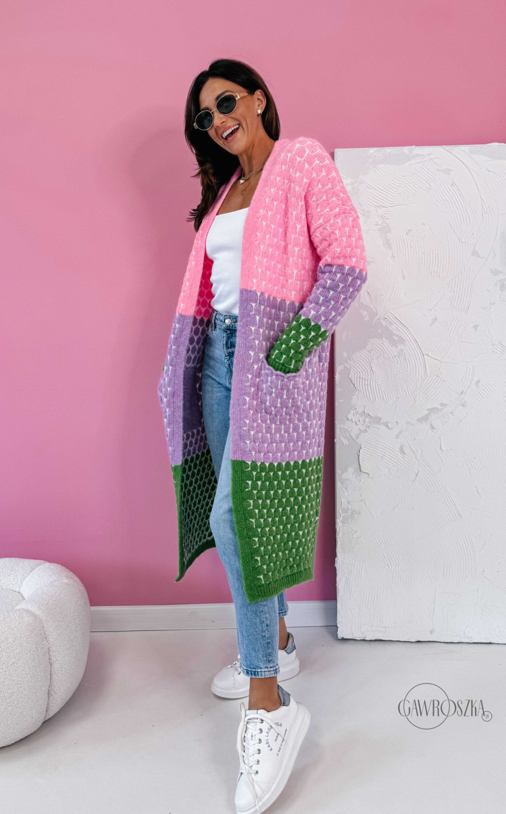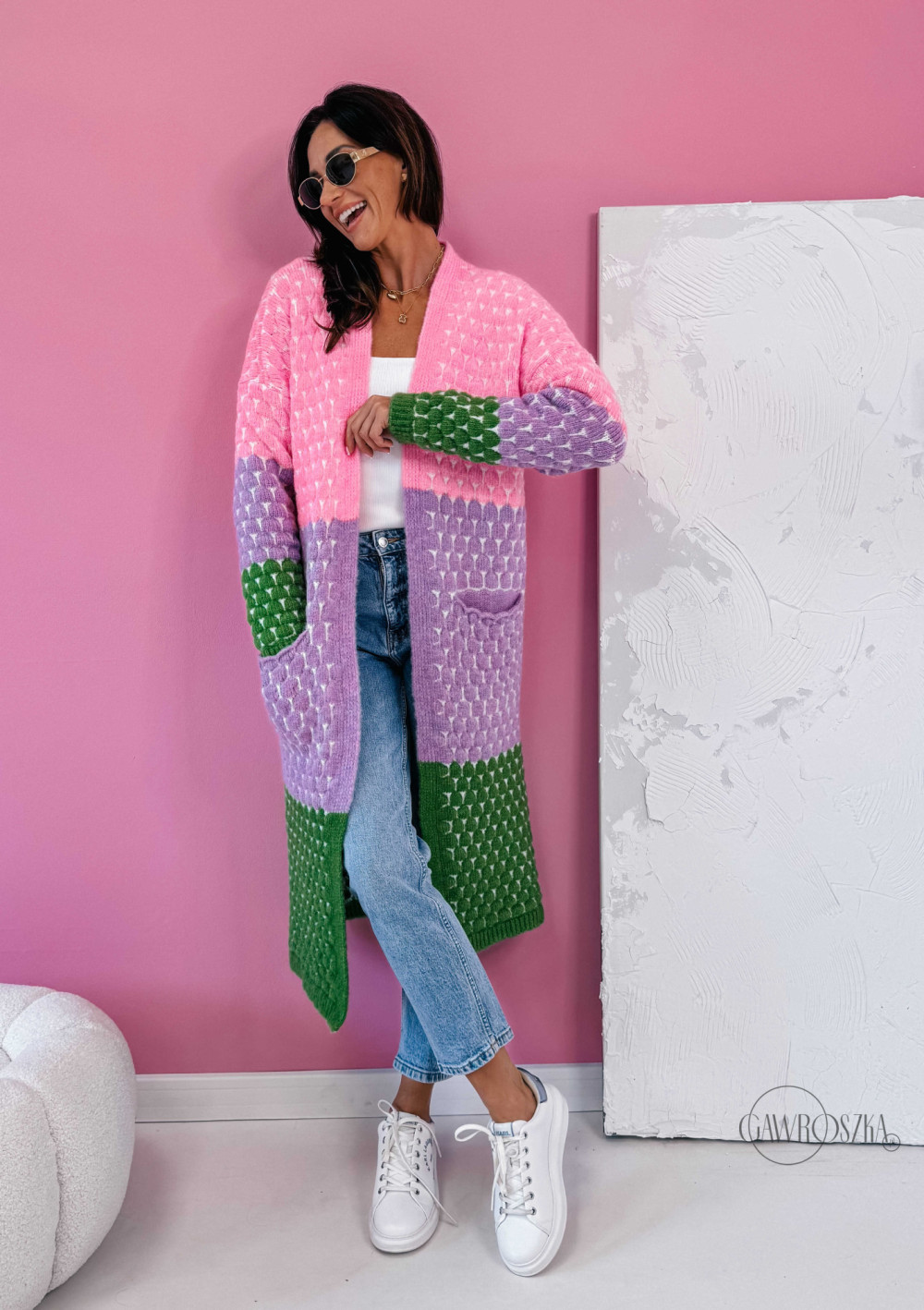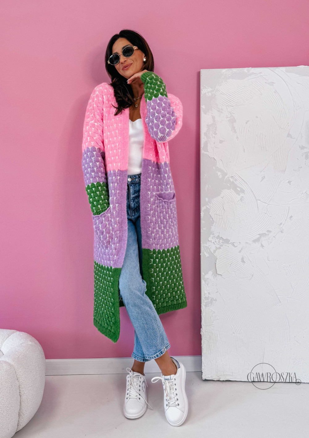 Długi kardigan z kieszeniami Becca - Baby róż-lila-trawa
