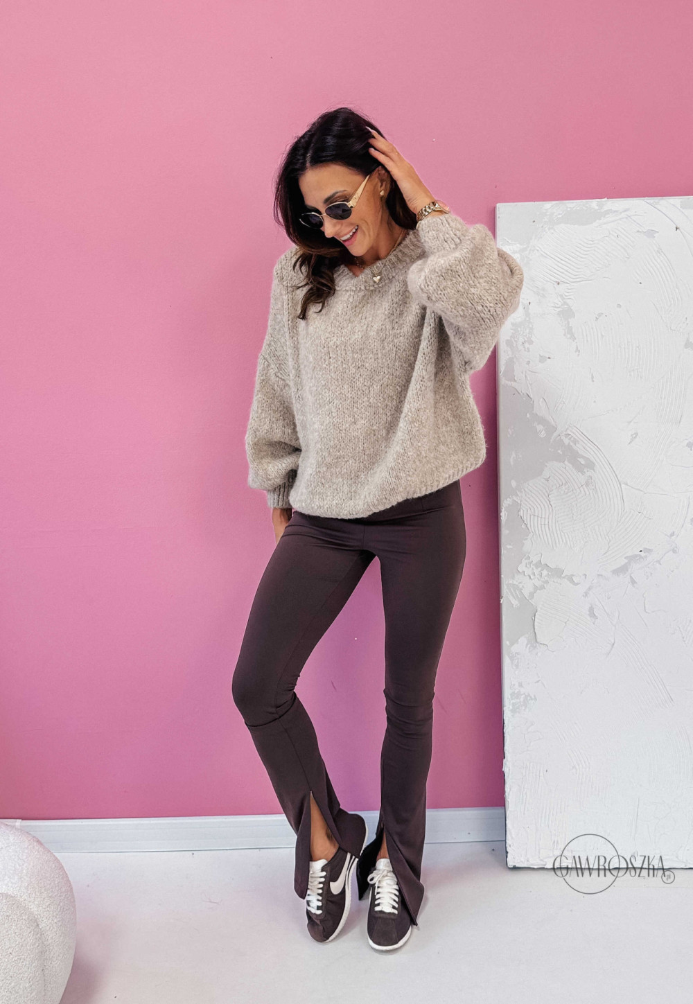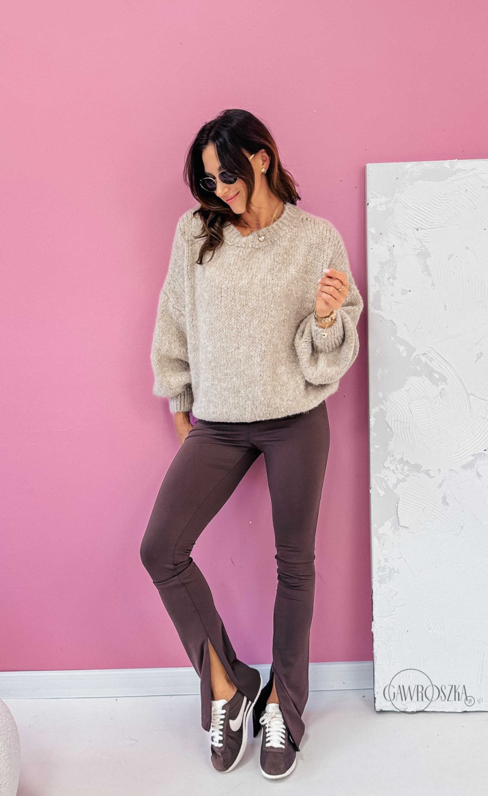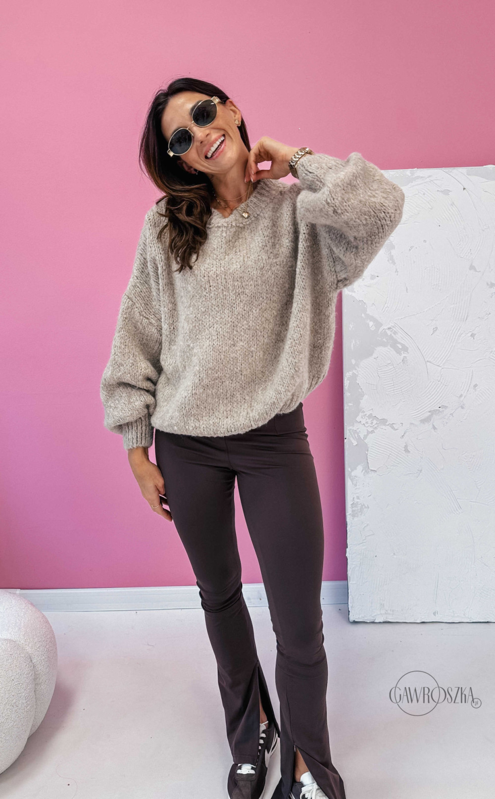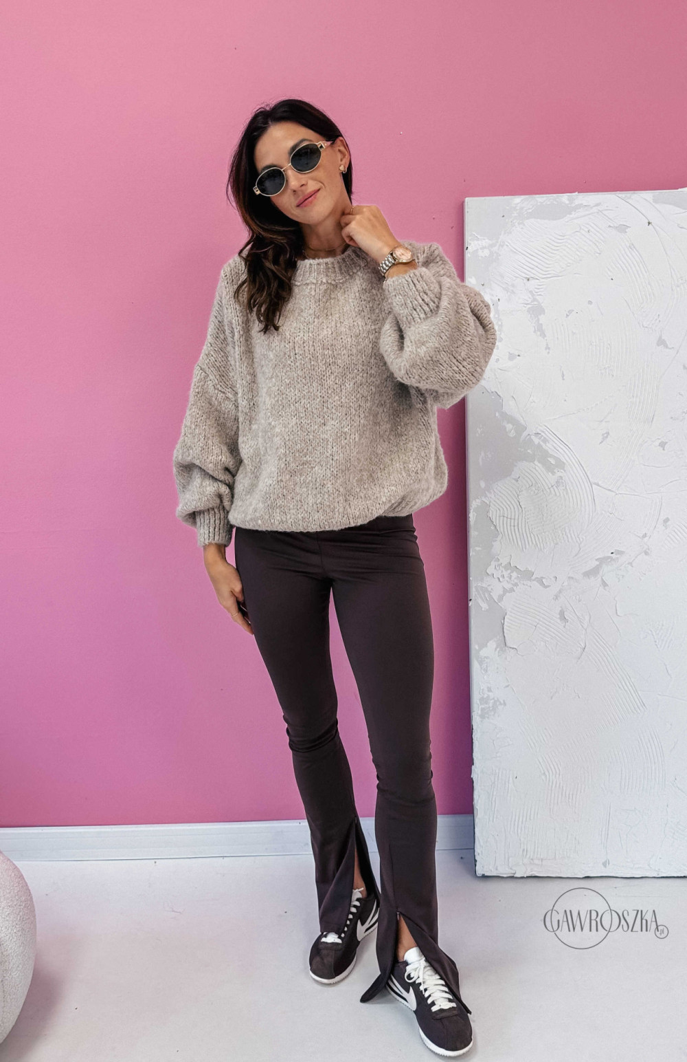 Mięsisty i mięciutki sweter, z domieszka wełny, posiada pięknie wykończony dekolt ściągaczem, który znajduje się również na rękawach