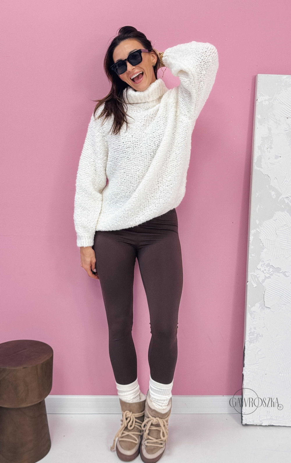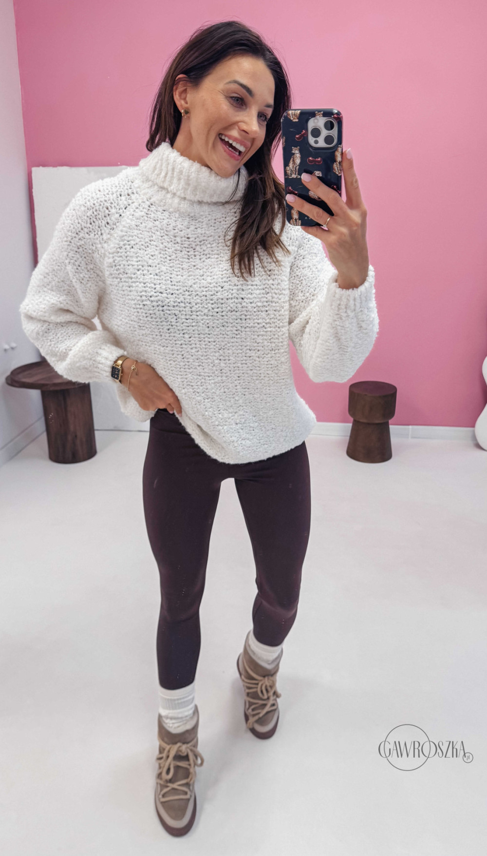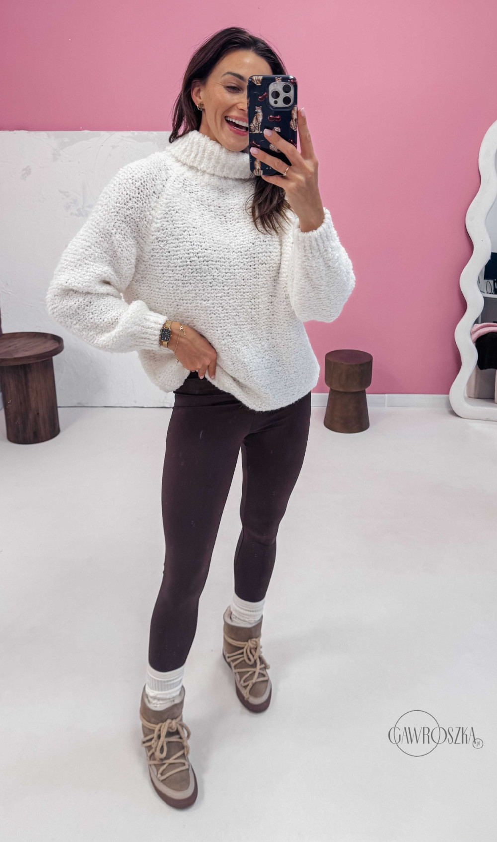 Ciepły, puszysty sweter oversize w białym kolorze to idealny wybór na zimowe dni. Stylowy i wygodny — pasuje do legginsów i jeansów