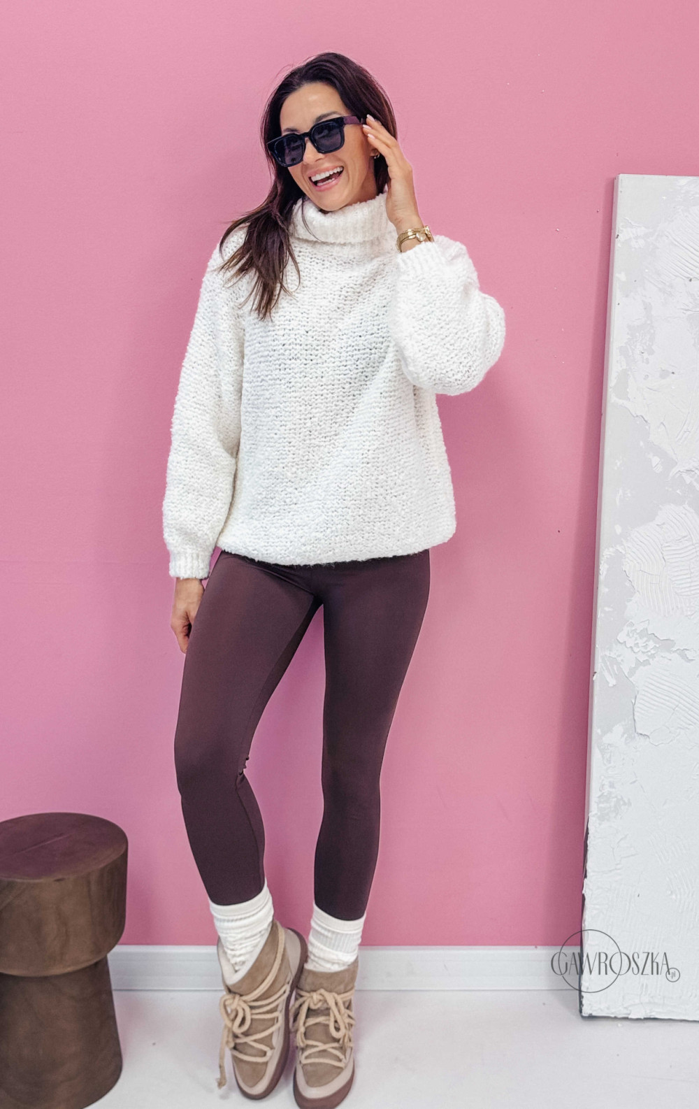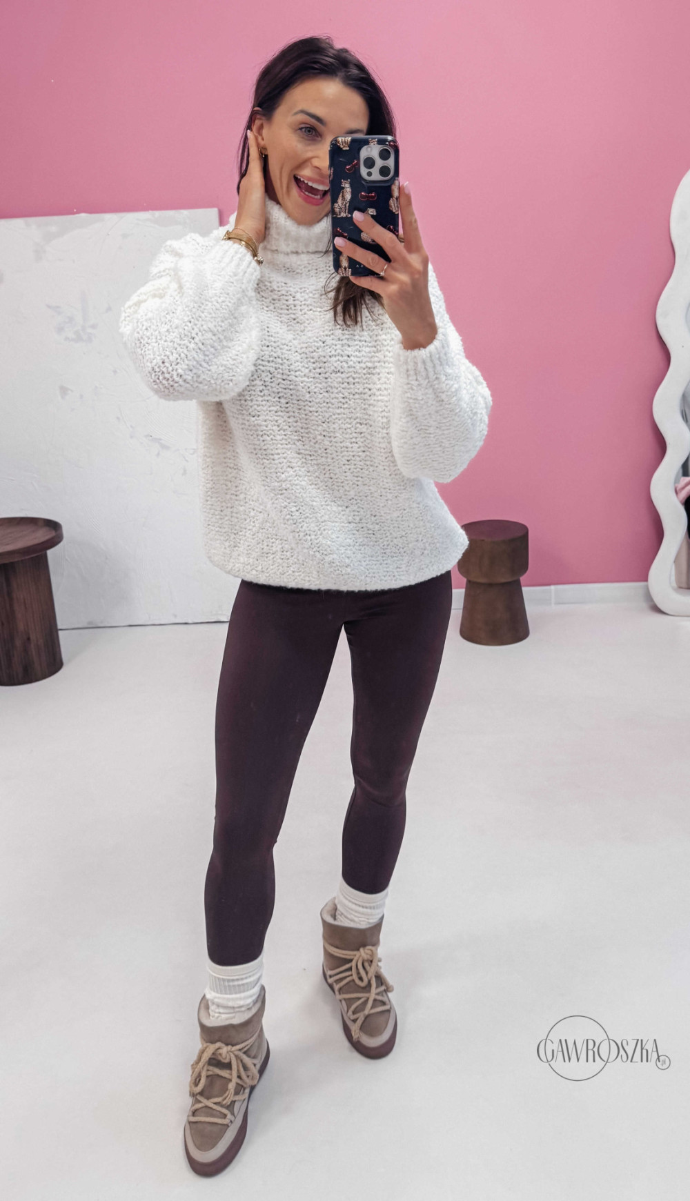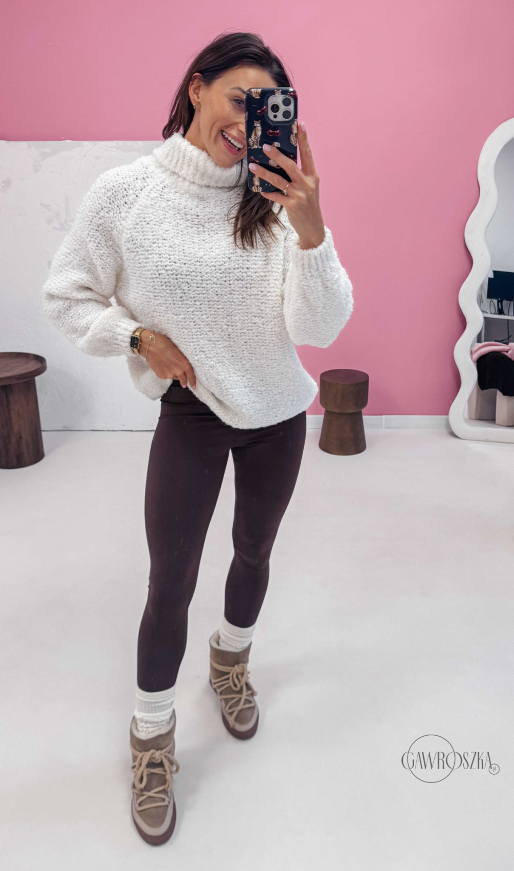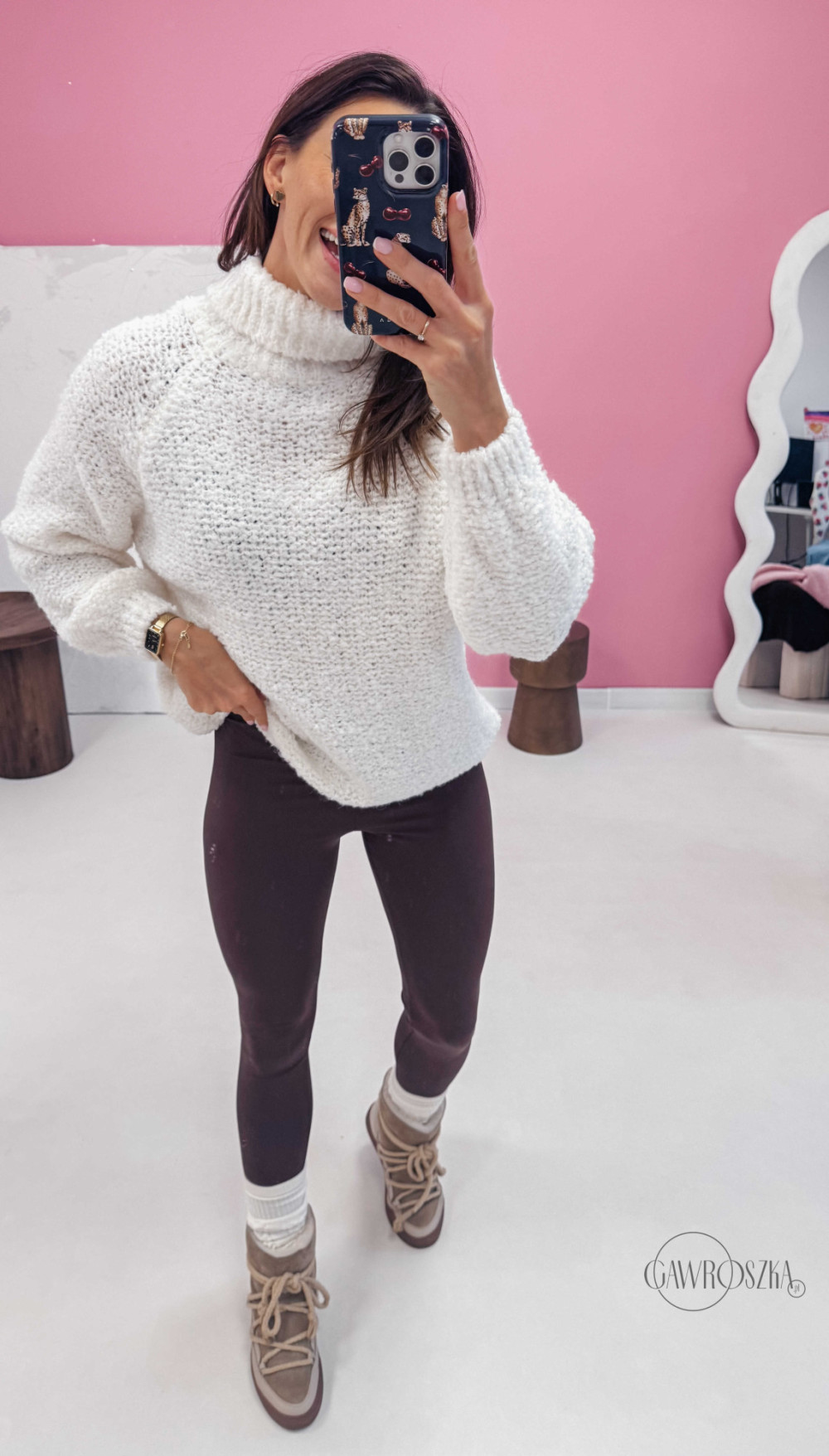 Ciepły, puszysty sweter oversize w białym kolorze to idealny wybór na zimowe dni. Stylowy i wygodny — pasuje do legginsów i jeansów
