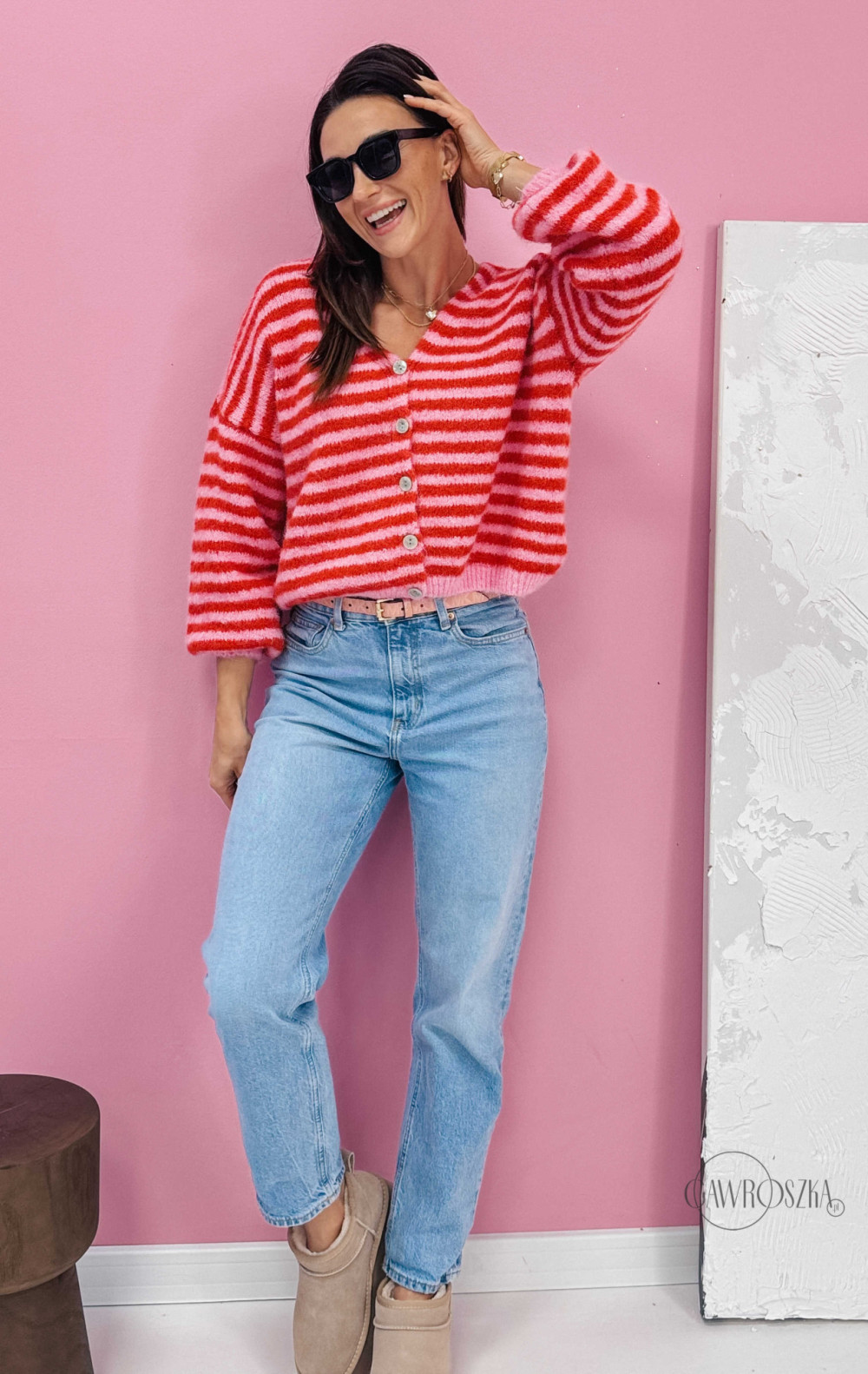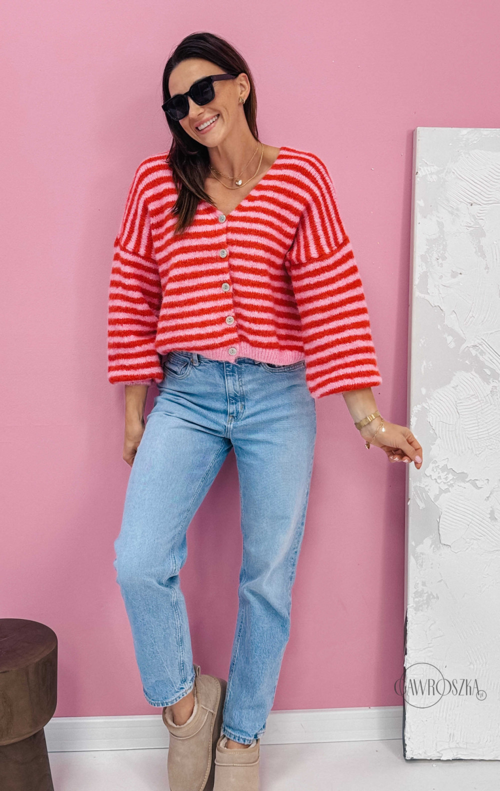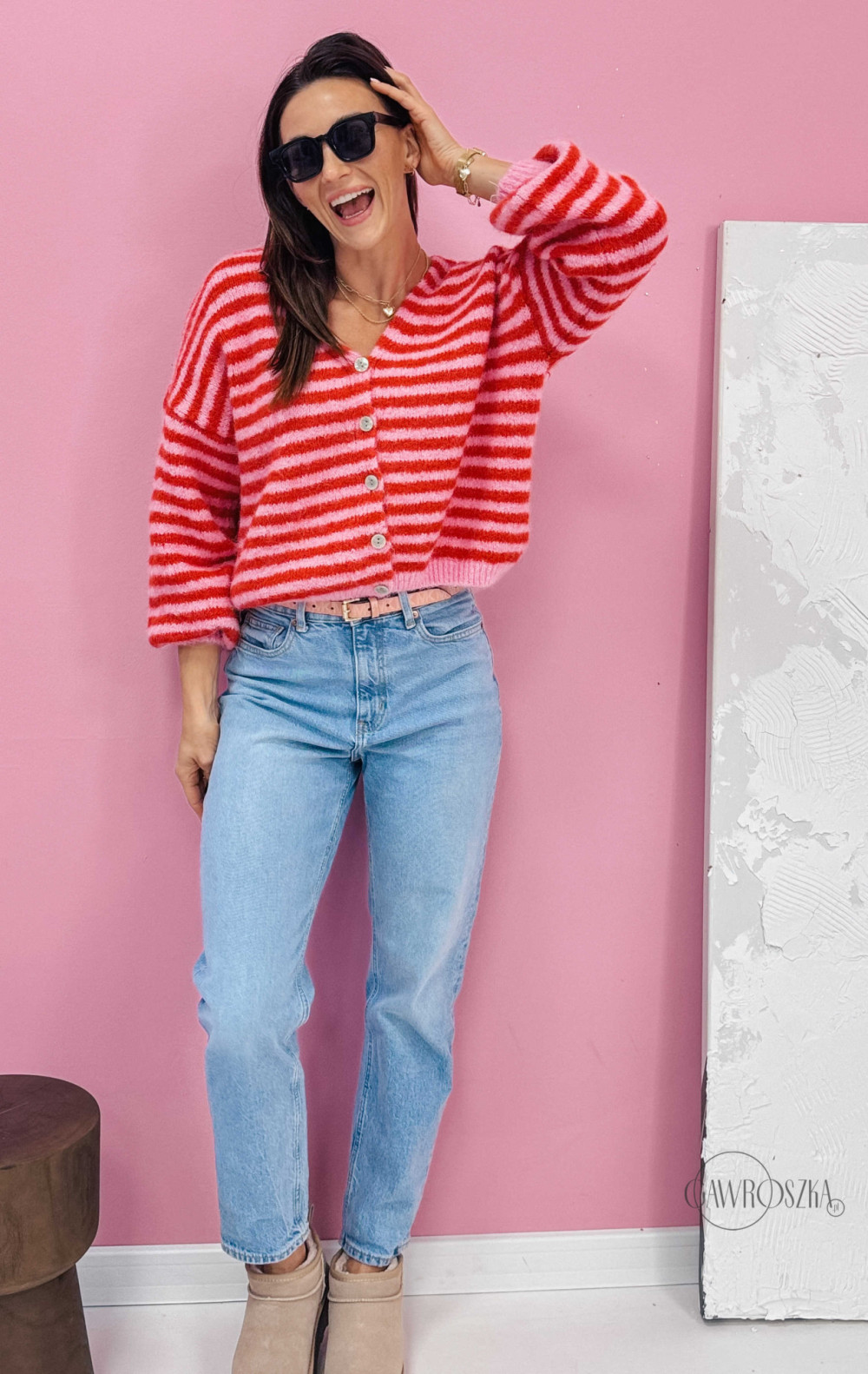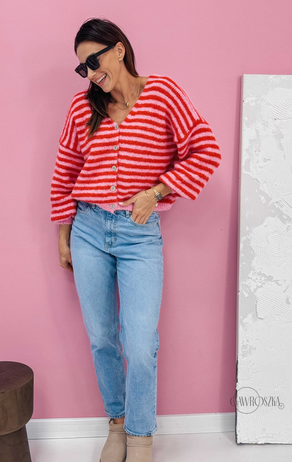 Energetyczny kardigan w paski przyciąga wzrok i dodaje stylizacji wyjątkowego uroku. Świetnie wygląda z jeansami i botkami