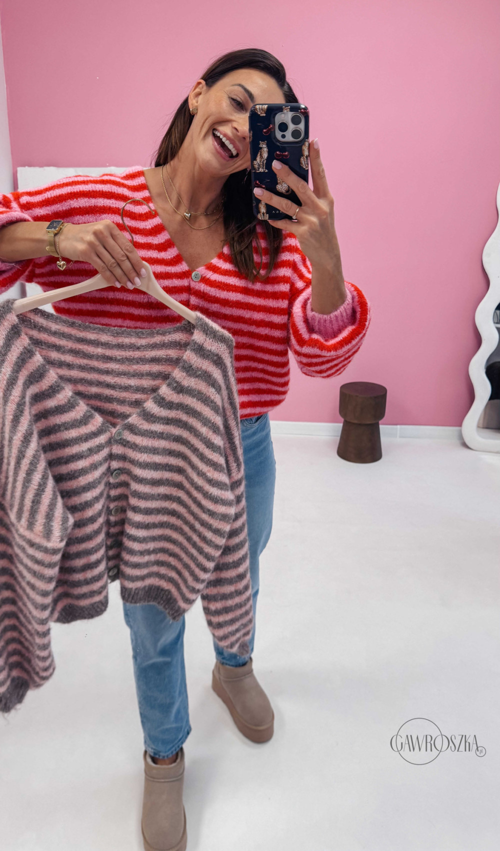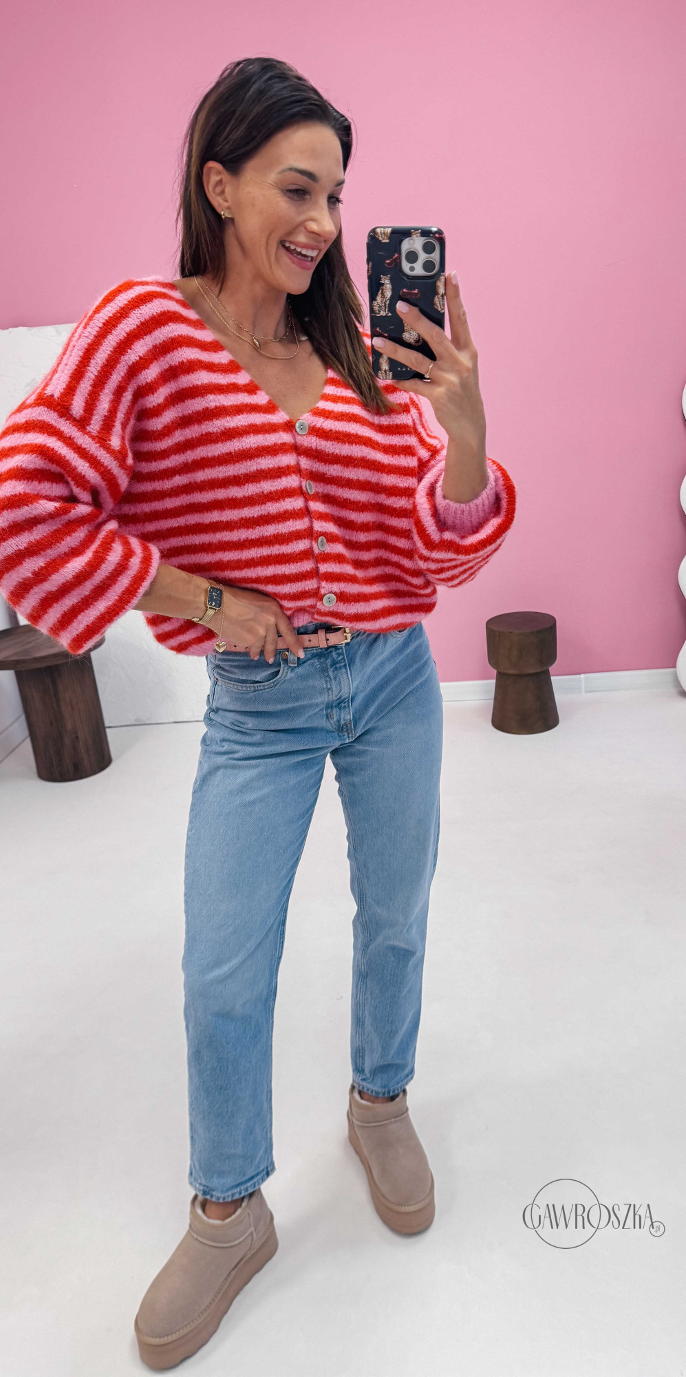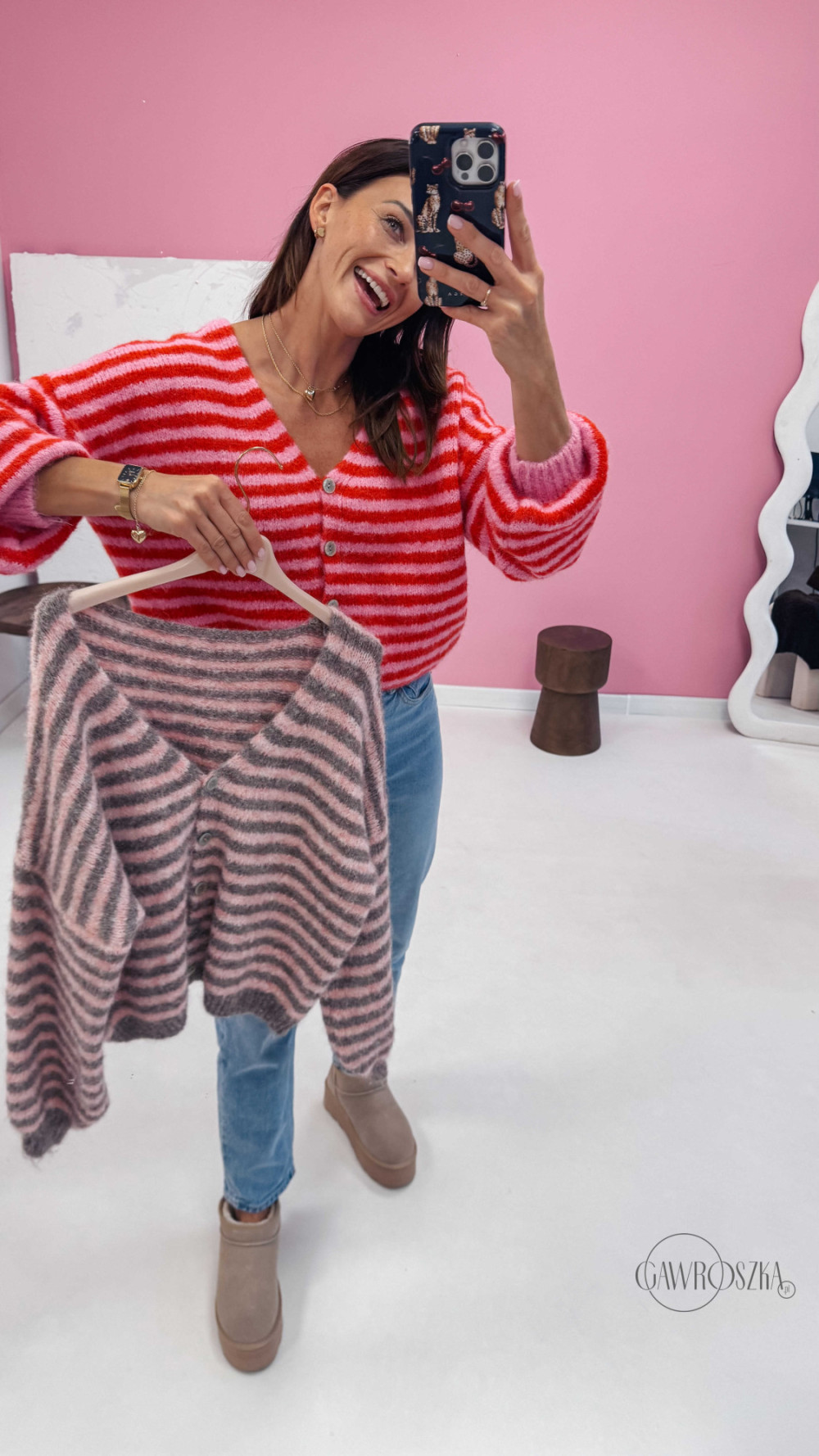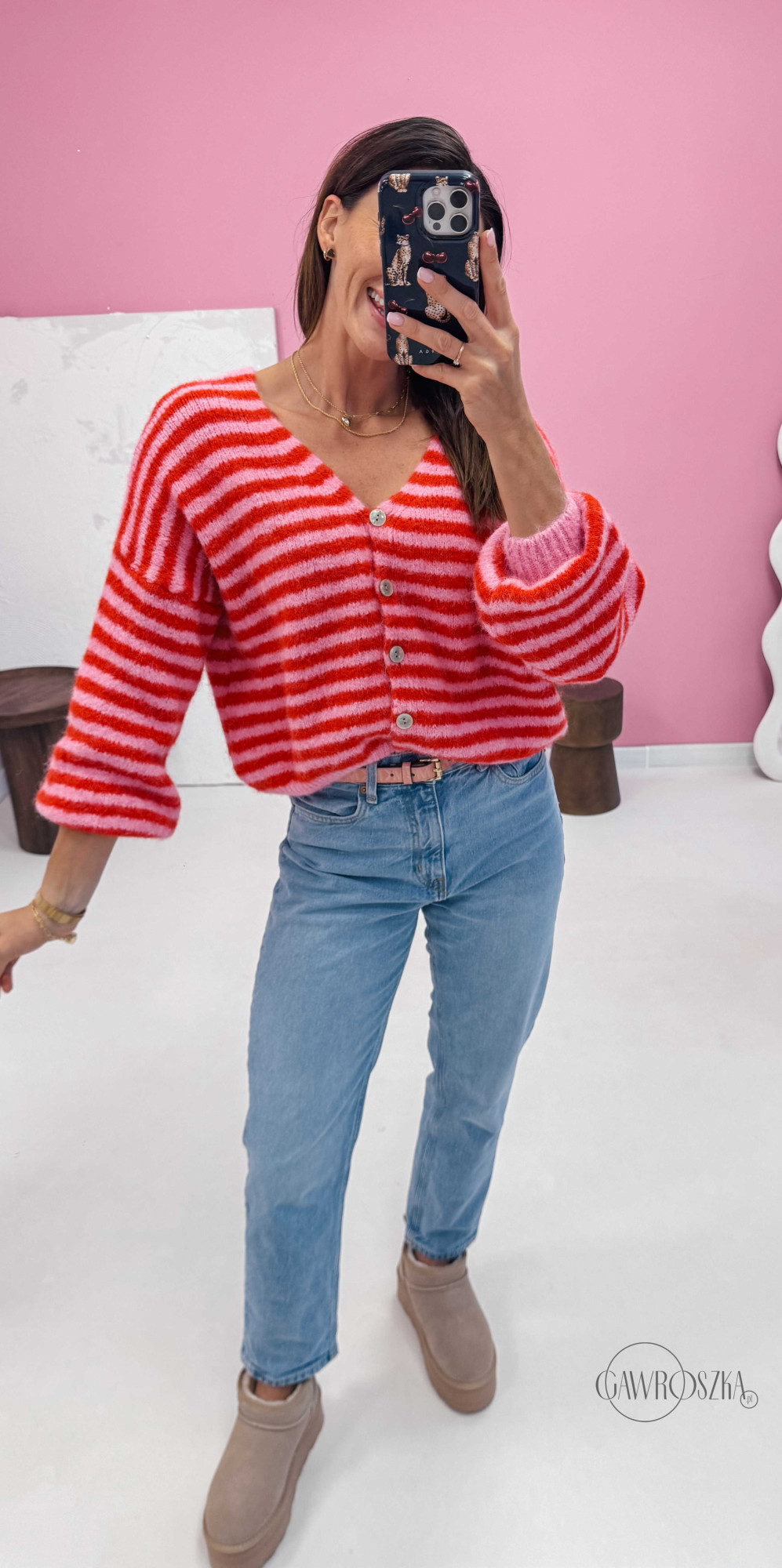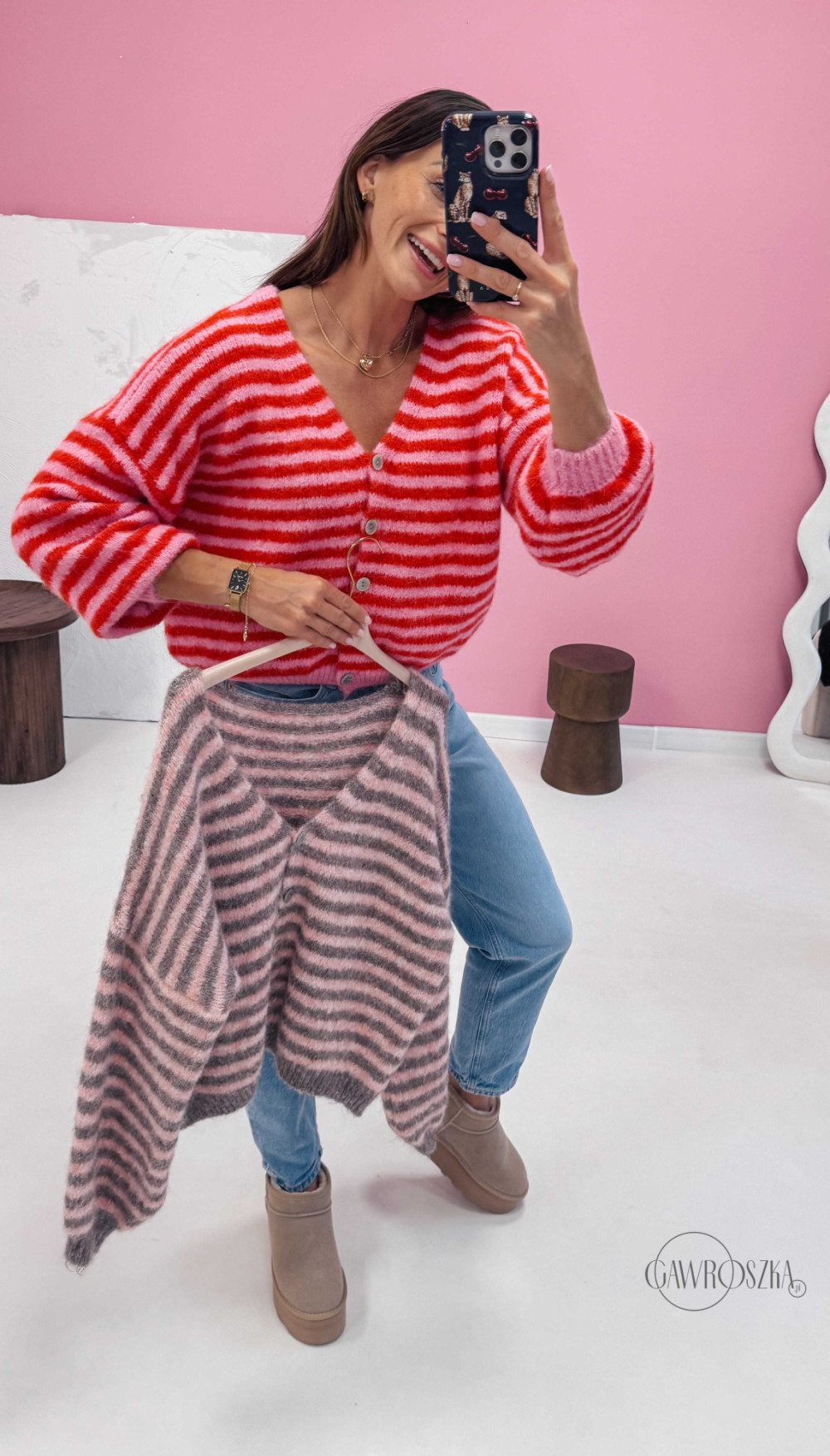 Energetyczny kardigan w paski przyciąga wzrok i dodaje stylizacji wyjątkowego uroku. Świetnie wygląda z jeansami i botkami
