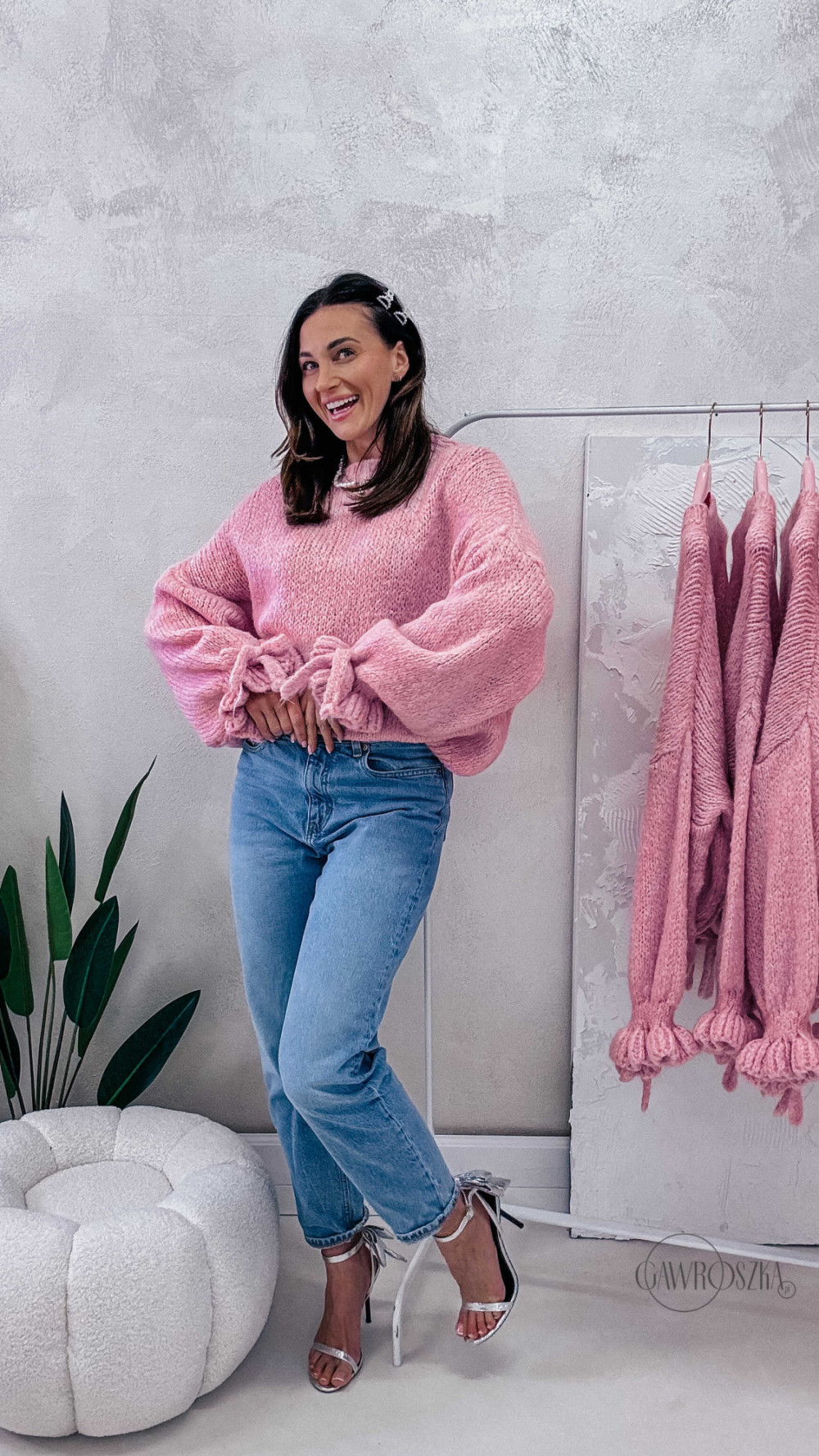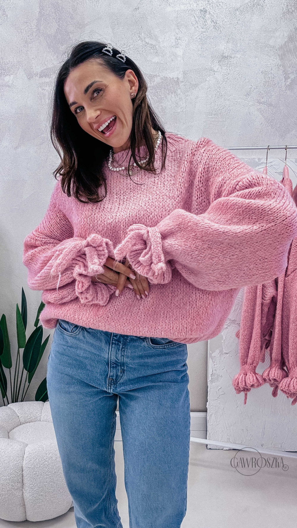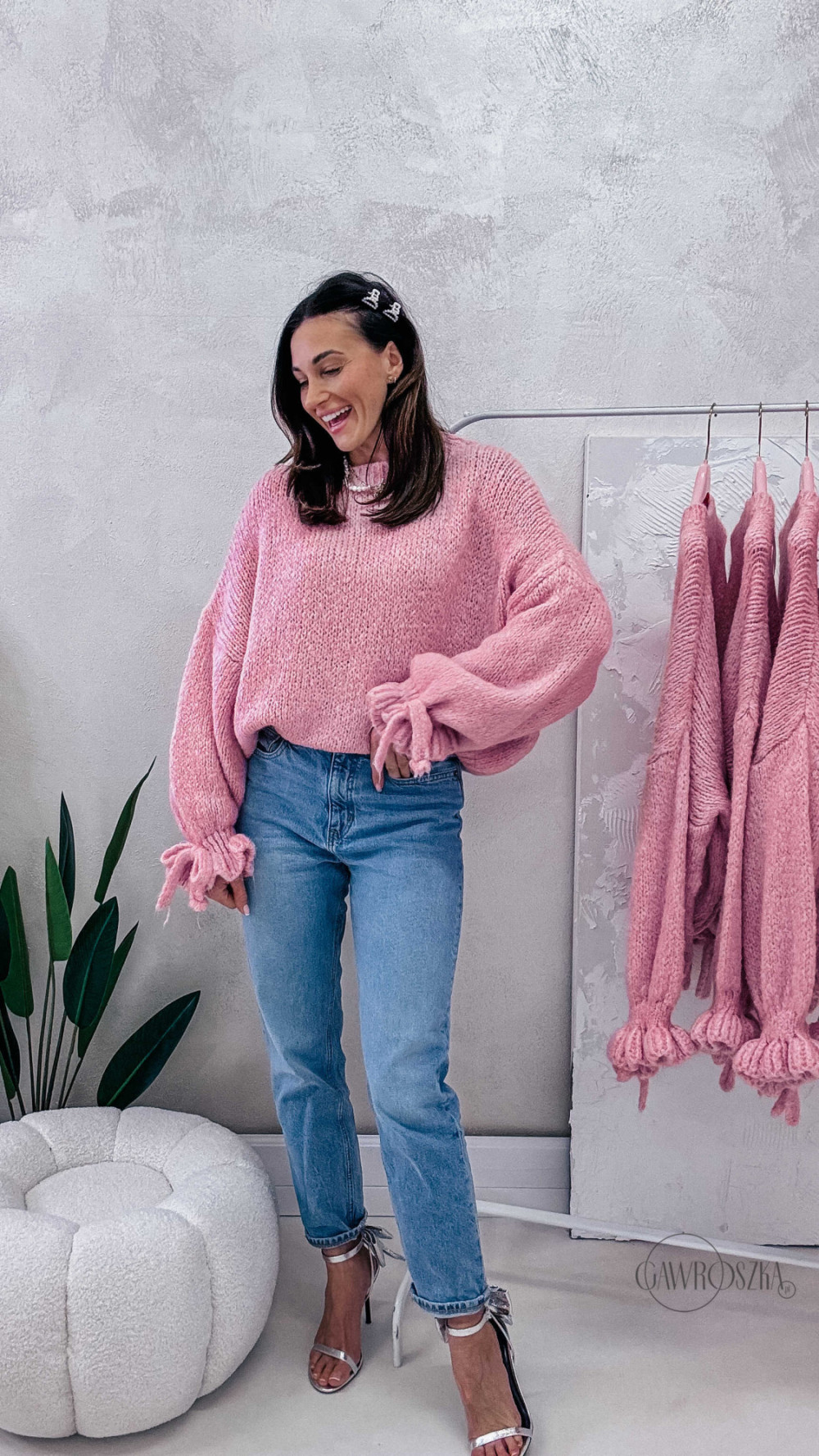 Miękki, przytulny i absolutnie wyjątkowy — sweter z efektownymi rękawami wykończonymi ozdobnym wiązaniem to propozycja dla kobiet, które lubią łączyć wygodę z modnym detalem. Luźny fason pięknie układa się na sylwetce, a przyjemna dzianina otula i zapewnia komfort noszenia przez cały dzień.