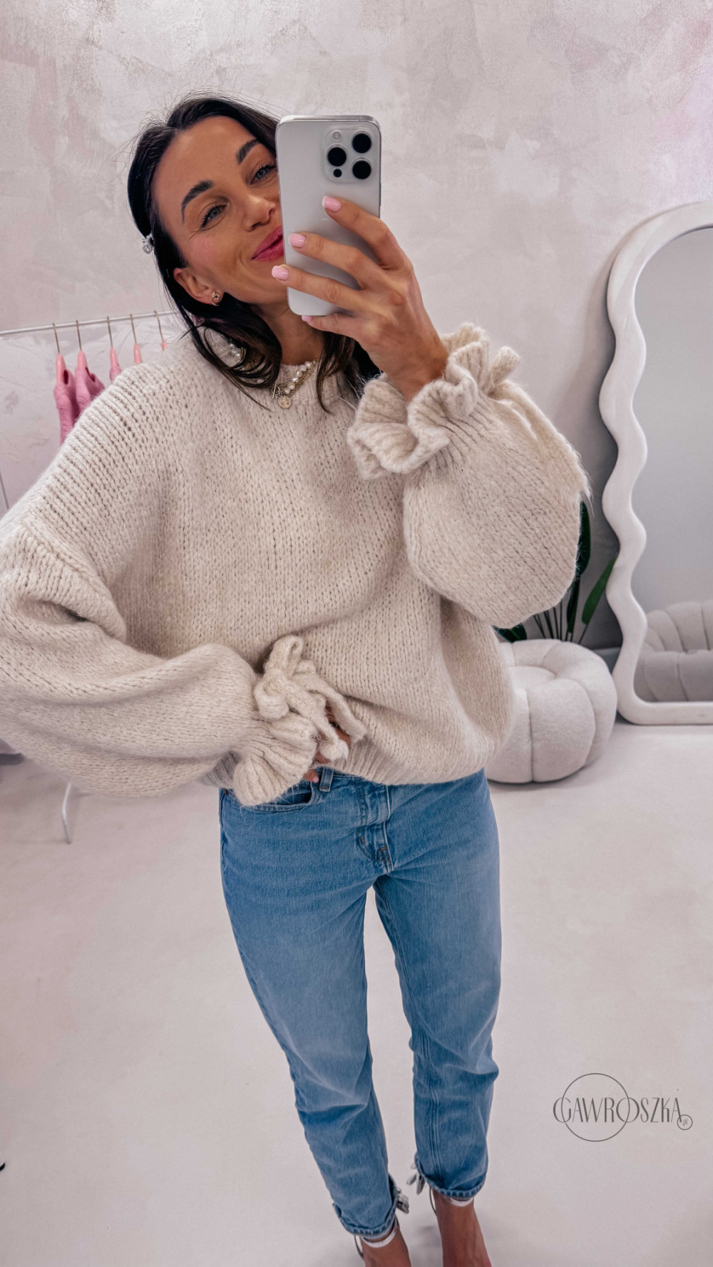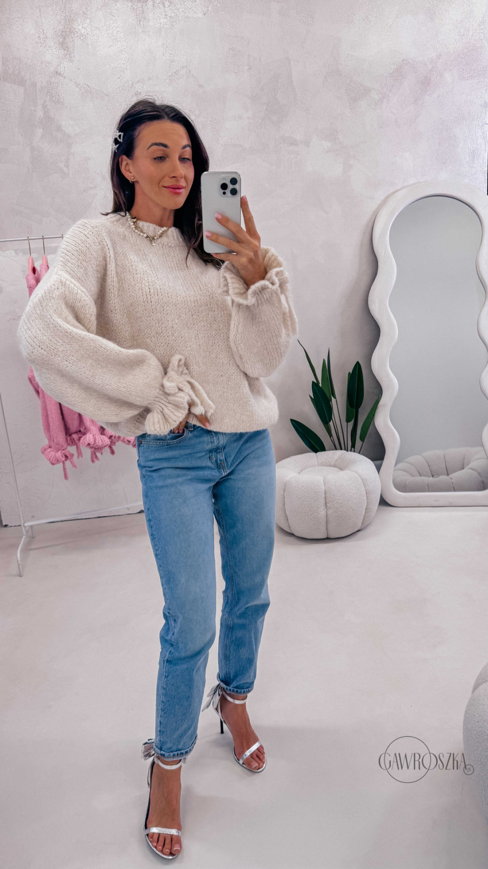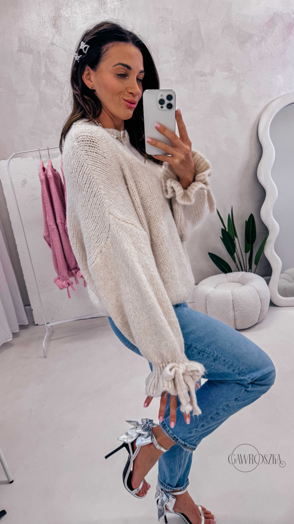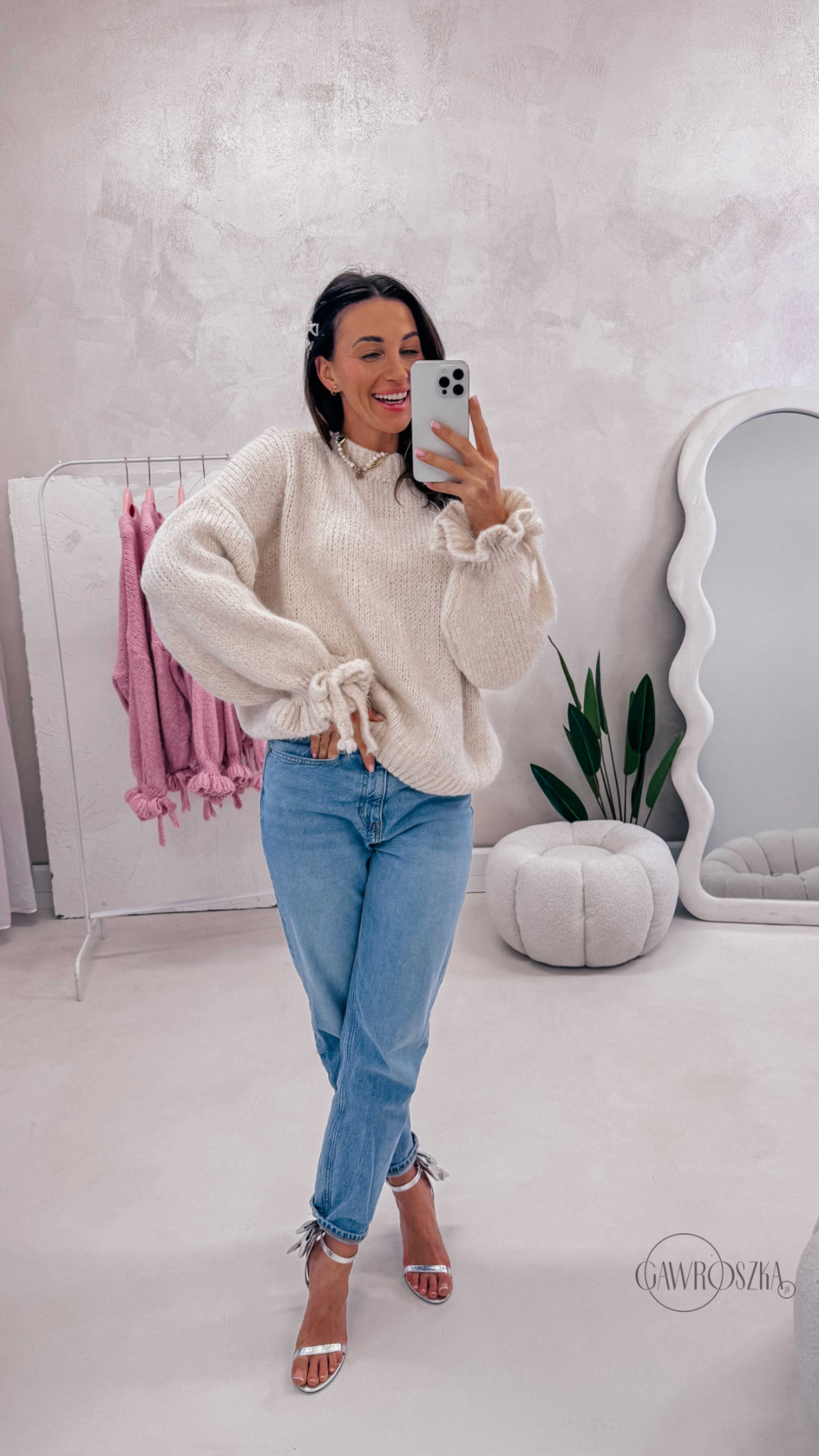 Miękki, przytulny i absolutnie wyjątkowy — sweter z efektownymi rękawami wykończonymi ozdobnym wiązaniem to propozycja dla kobiet, które lubią łączyć wygodę z modnym detalem. Luźny fason pięknie układa się na sylwetce, a przyjemna dzianina otula i zapewnia komfort noszenia przez cały dzień.