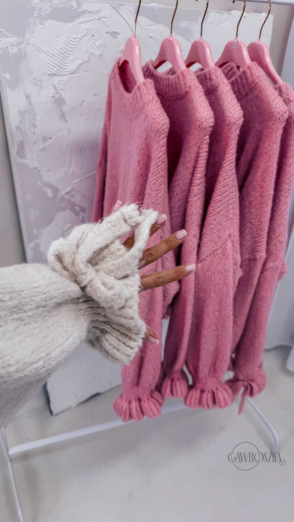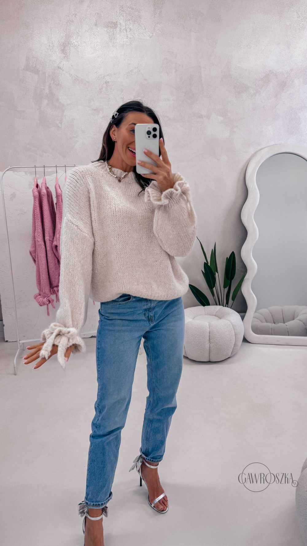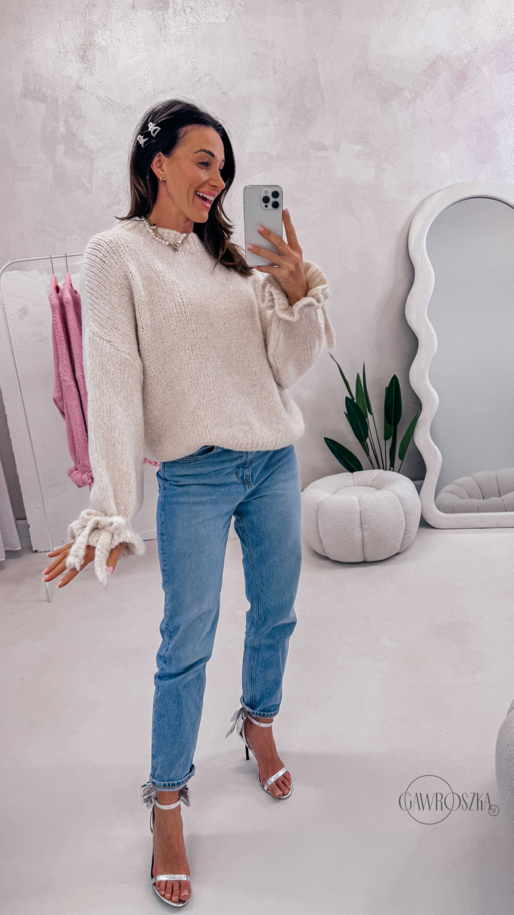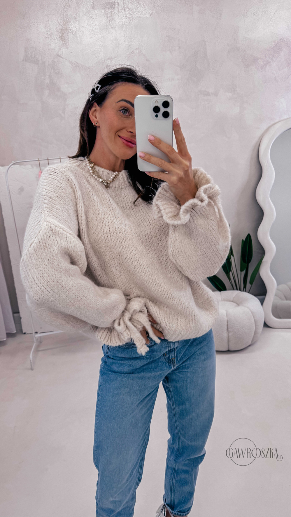 Miękki, przytulny i absolutnie wyjątkowy — sweter z efektownymi rękawami wykończonymi ozdobnym wiązaniem to propozycja dla kobiet, które lubią łączyć wygodę z modnym detalem. Luźny fason pięknie układa się na sylwetce, a przyjemna dzianina otula i zapewnia komfort noszenia przez cały dzień.