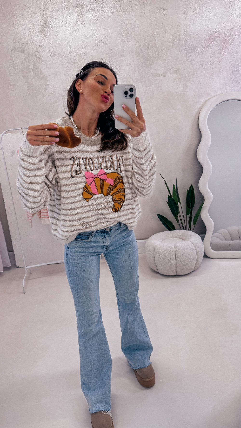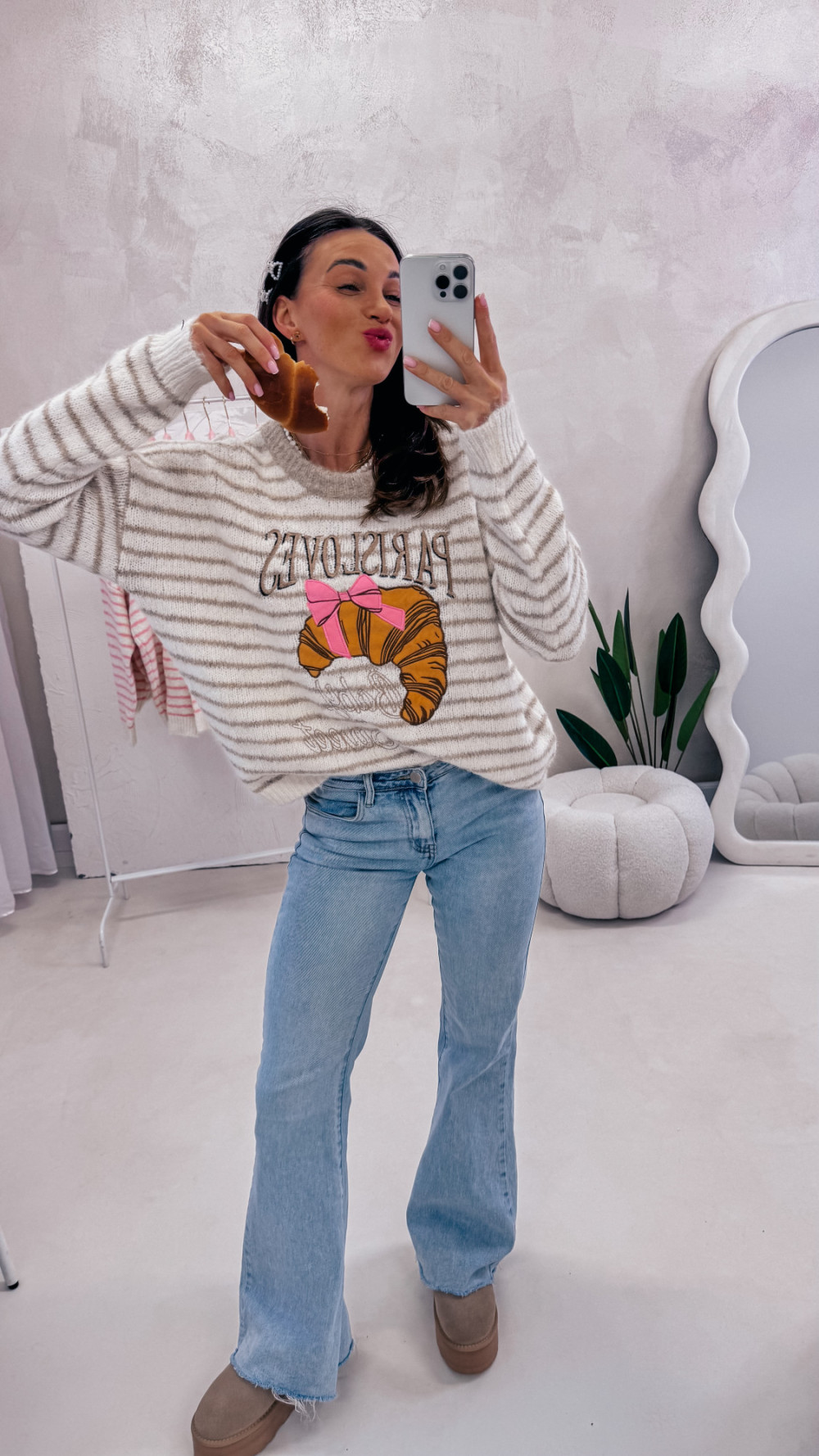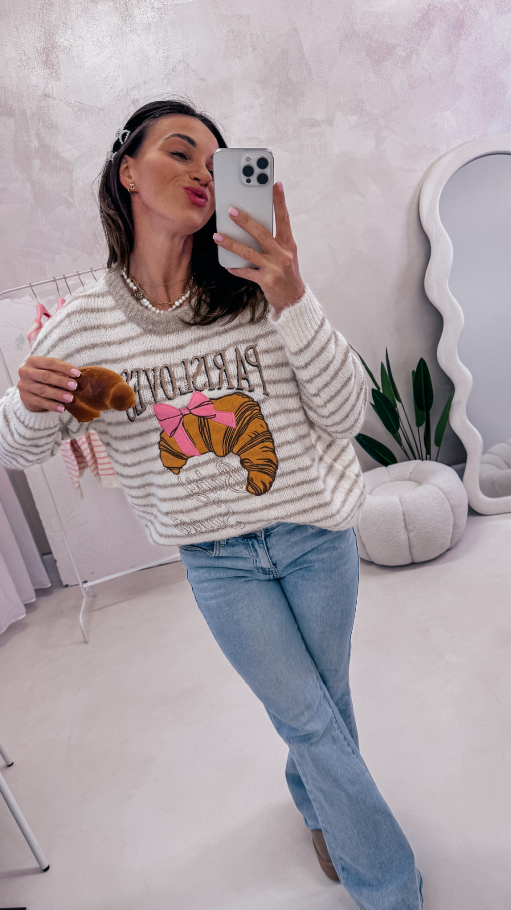 Miękki, przytulny i pełen uroku — sweter w paski z zabawnym motywem croissanta i napisem to idealny wybór na codzienne stylizacje z nutą luzu i dobrego humoru. Luźny fason zapewnia komfort noszenia, a przyjemna w dotyku dzianina sprawia, że nie chce się go zdejmować.