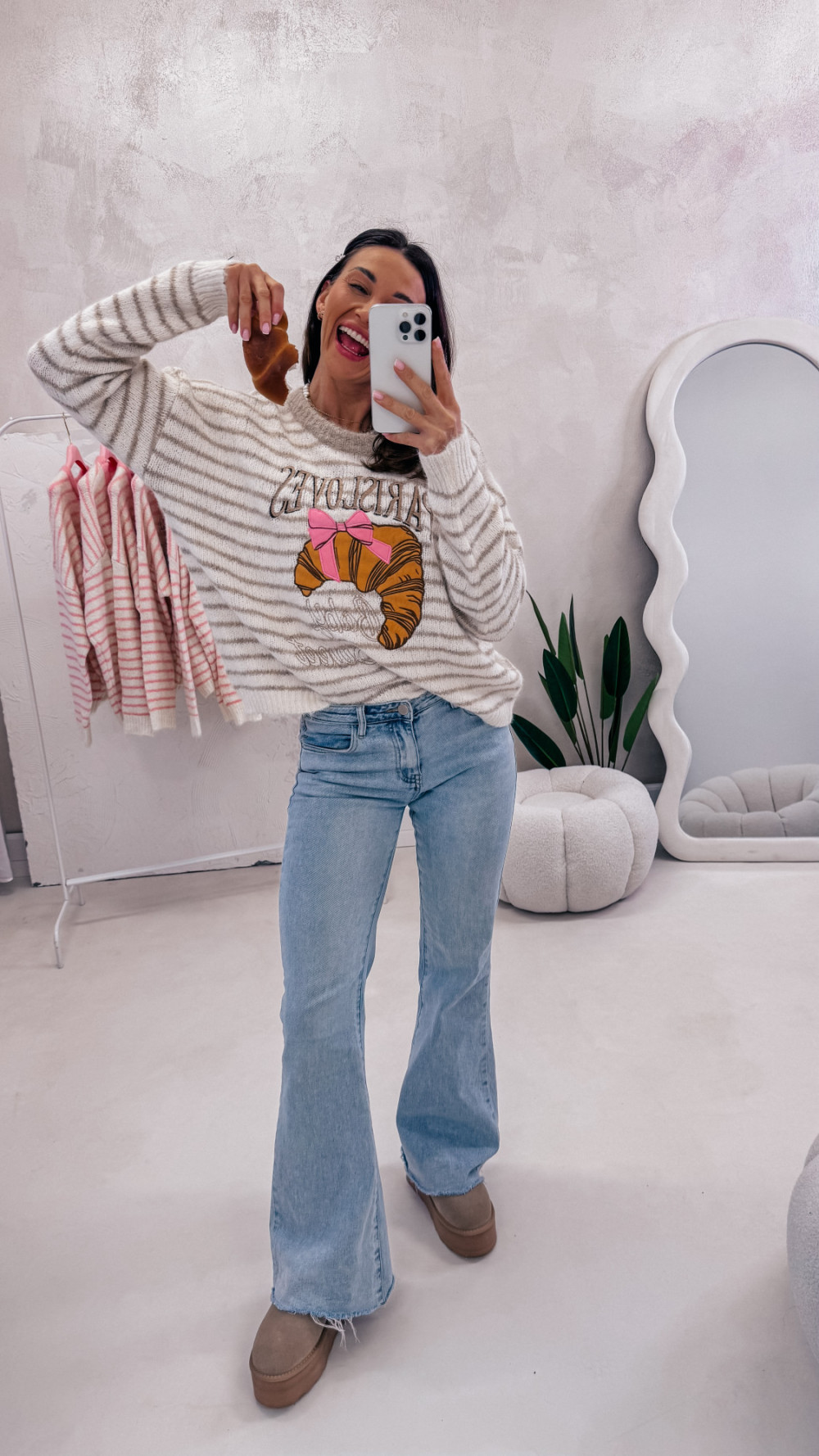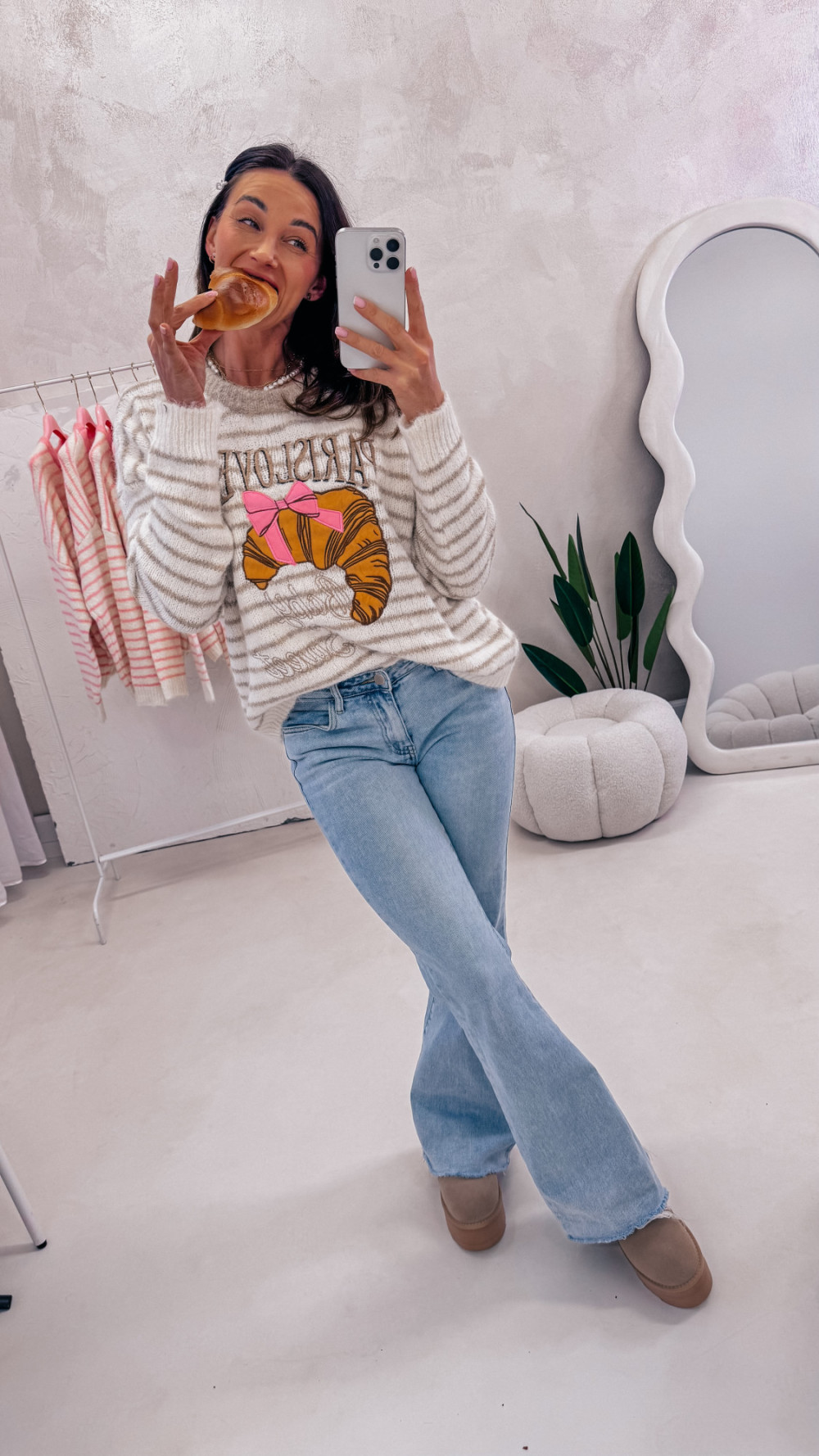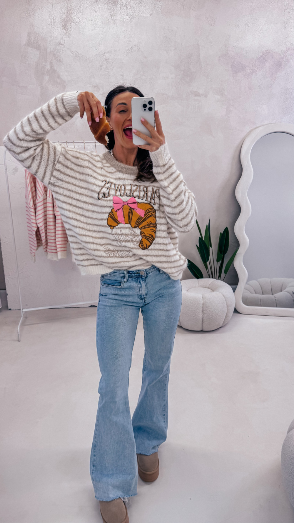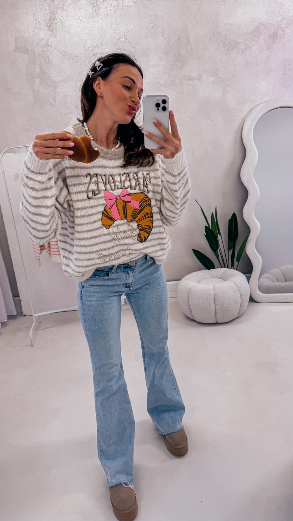 Miękki, przytulny i pełen uroku — sweter w paski z zabawnym motywem croissanta i napisem to idealny wybór na codzienne stylizacje z nutą luzu i dobrego humoru. Luźny fason zapewnia komfort noszenia, a przyjemna w dotyku dzianina sprawia, że nie chce się go zdejmować.