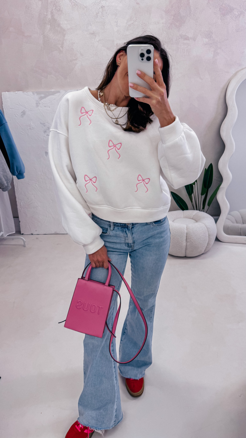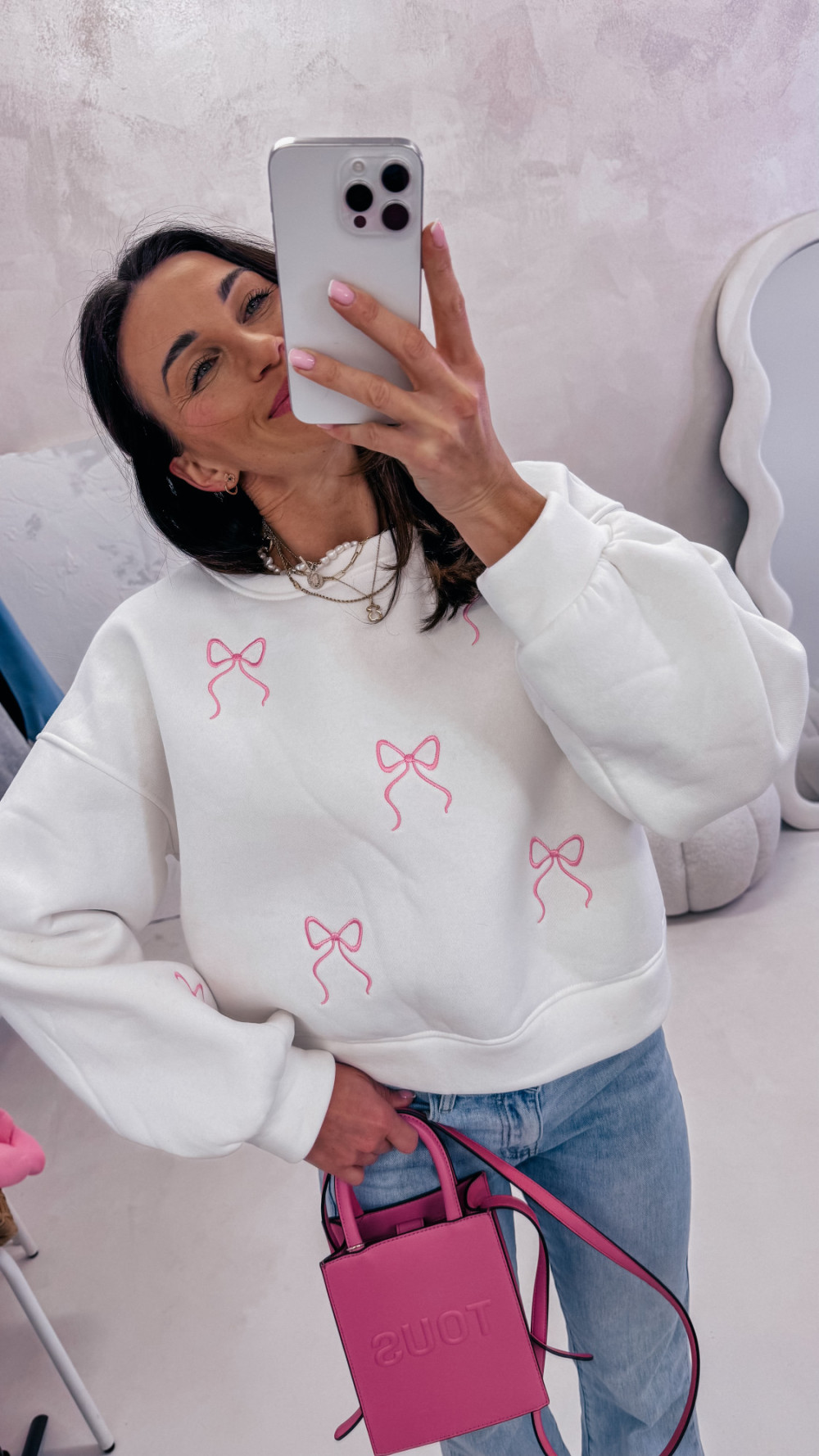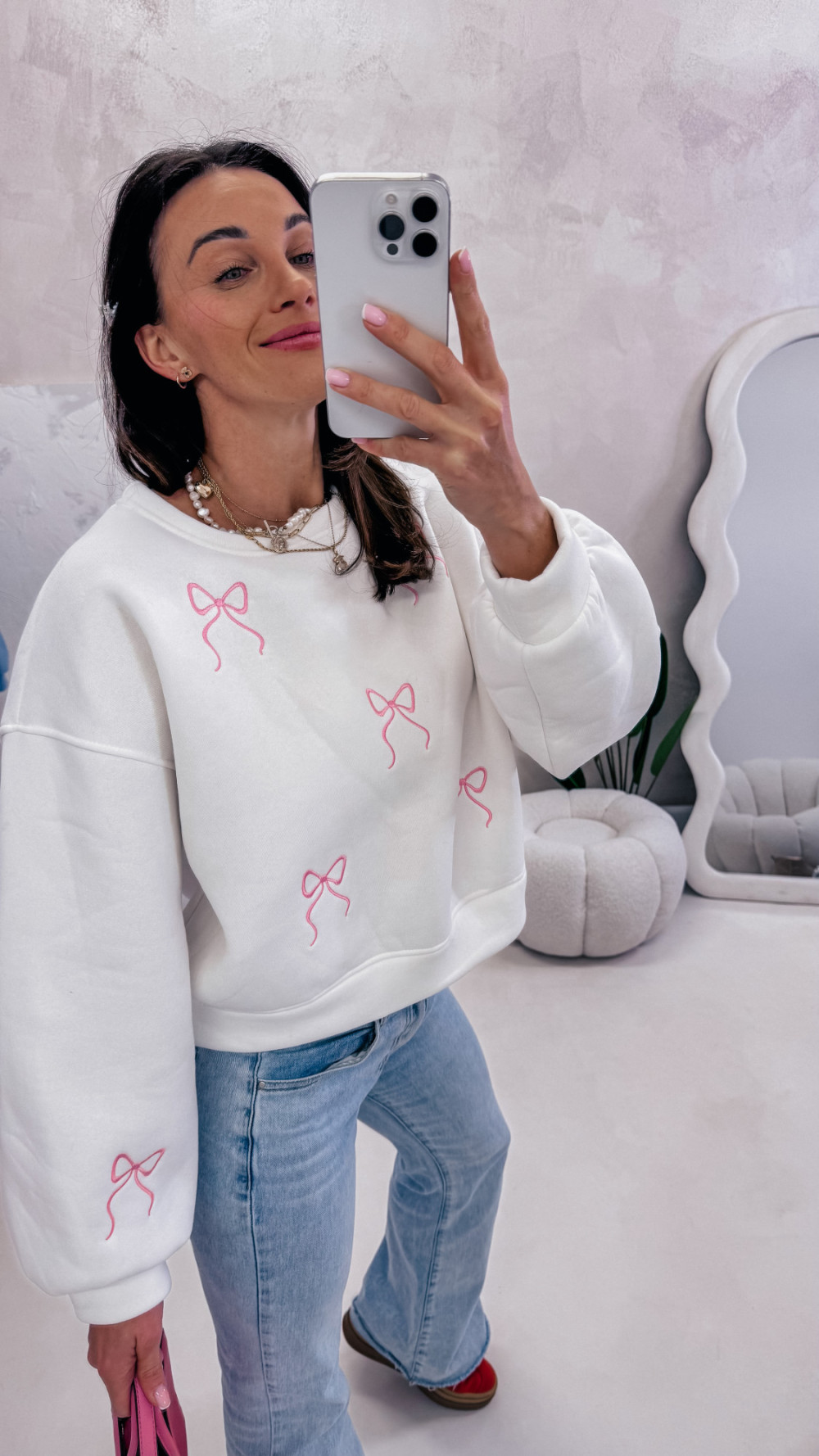 Miękka, wygodna i pełna uroku — bluza z delikatnym motywem kokardek to idealna propozycja na codzienne stylizacje z nutą słodyczy. Luźny fason zapewnia komfort noszenia, a przyjemna w dotyku tkanina sprawia, że to model, po który chce się sięgać każdego dnia.