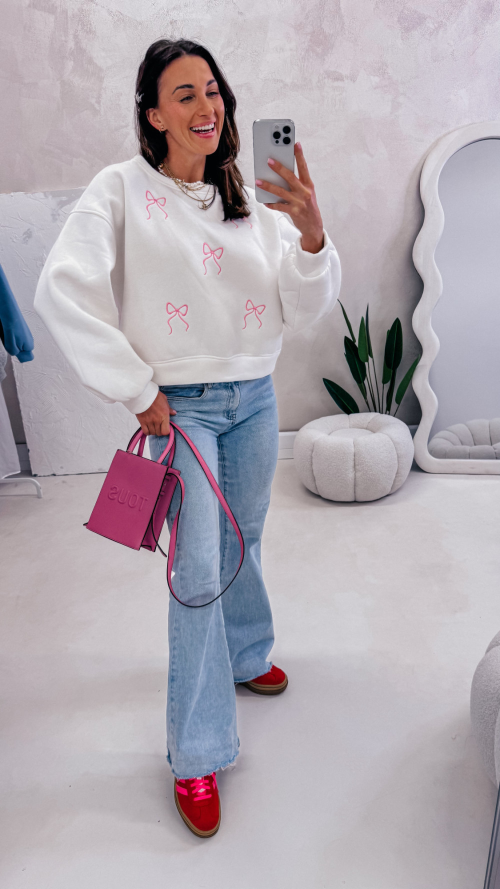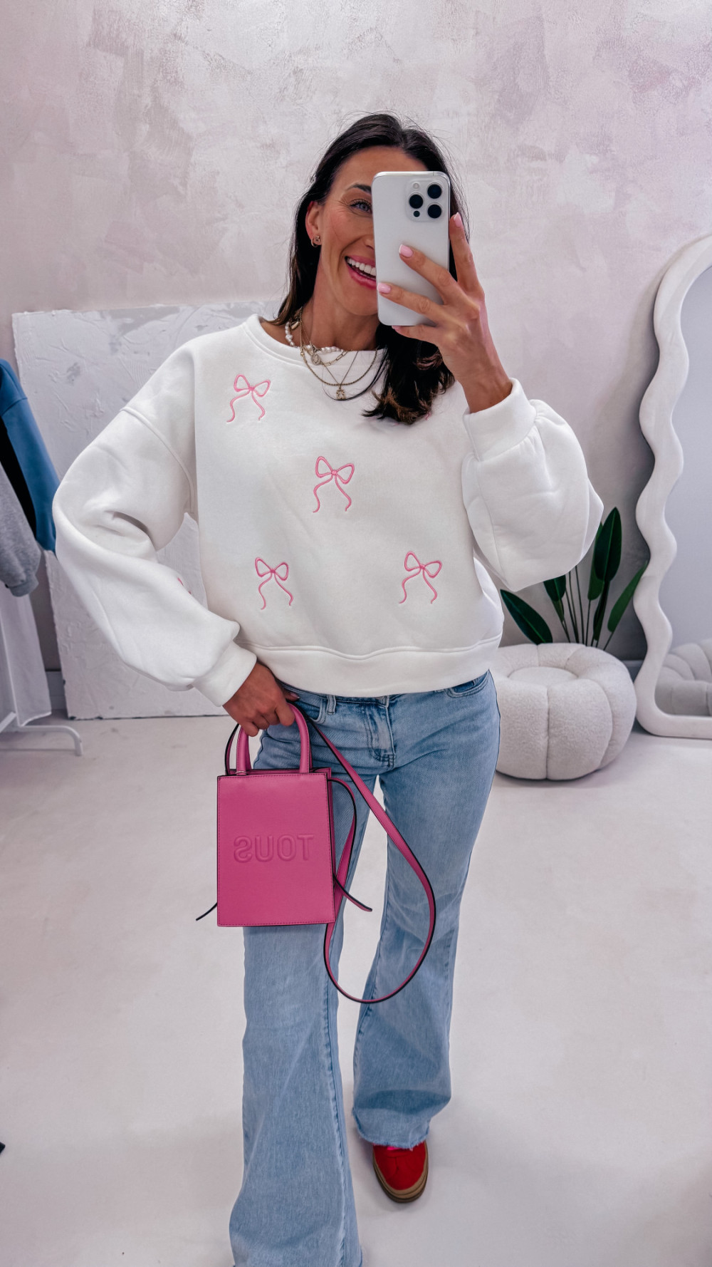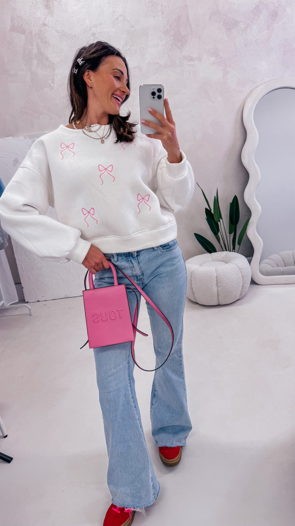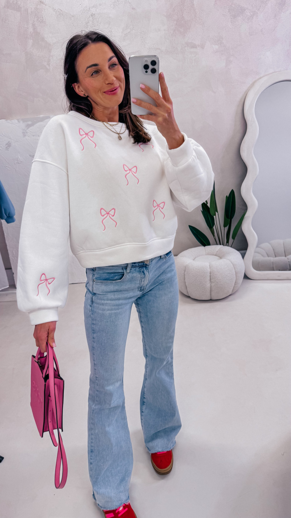 Miękka, wygodna i pełna uroku — bluza z delikatnym motywem kokardek to idealna propozycja na codzienne stylizacje z nutą słodyczy. Luźny fason zapewnia komfort noszenia, a przyjemna w dotyku tkanina sprawia, że to model, po który chce się sięgać każdego dnia.