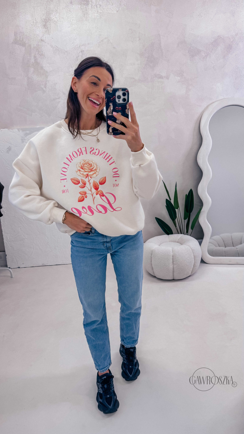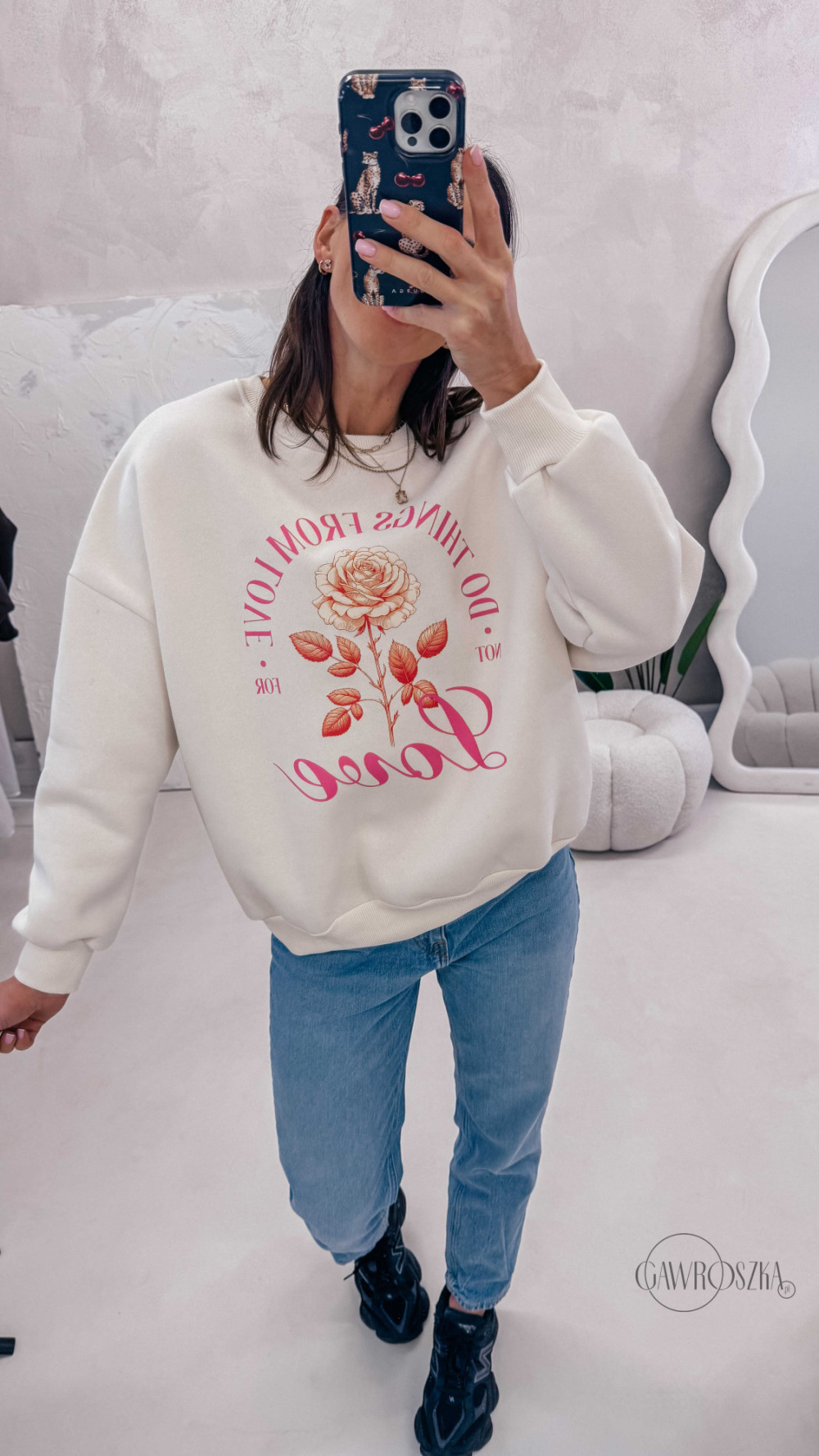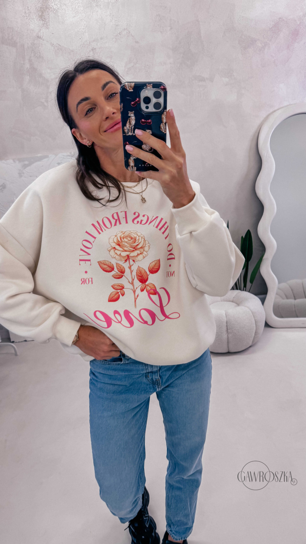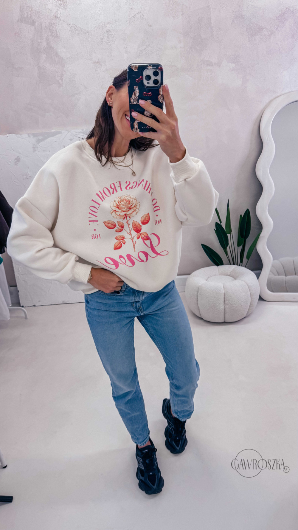 Delikatny print dodaje stylizacji lekkości i sprawia, że bluza świetnie komponuje się zarówno z jeansami, jak i bardziej casualowymi zestawami. Idealna na codzienne wyjścia, spacery i chwile tylko dla siebie.