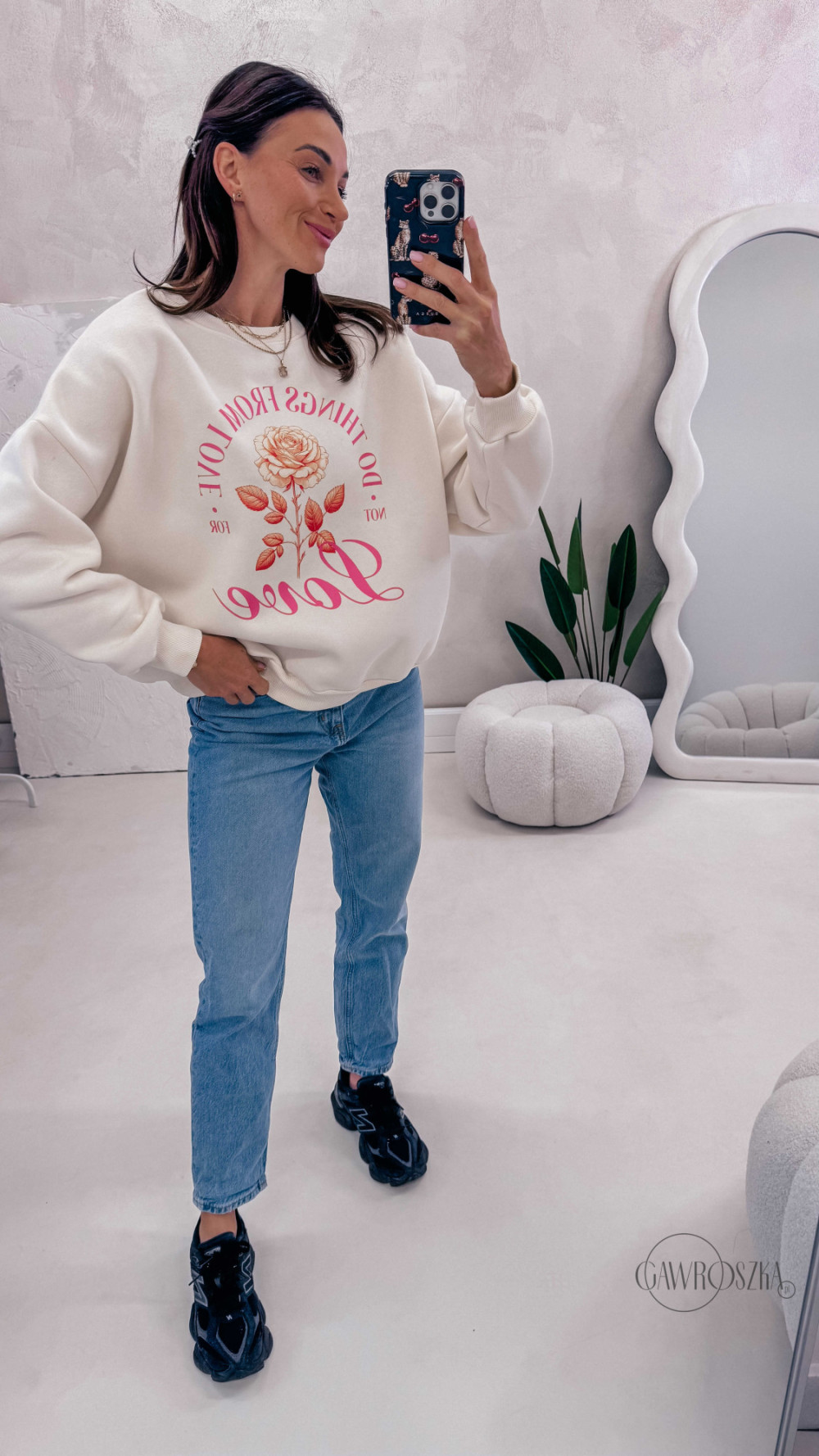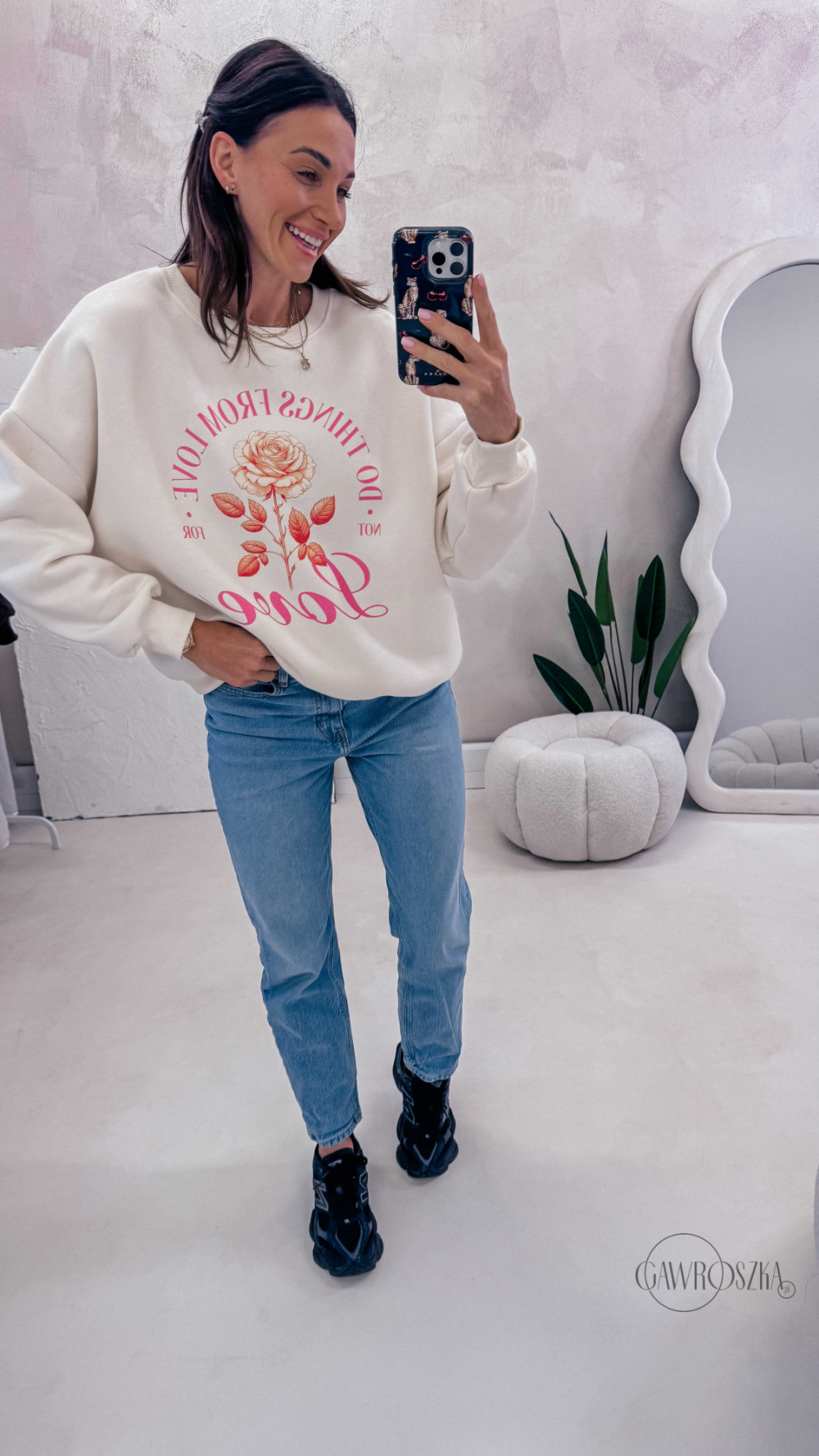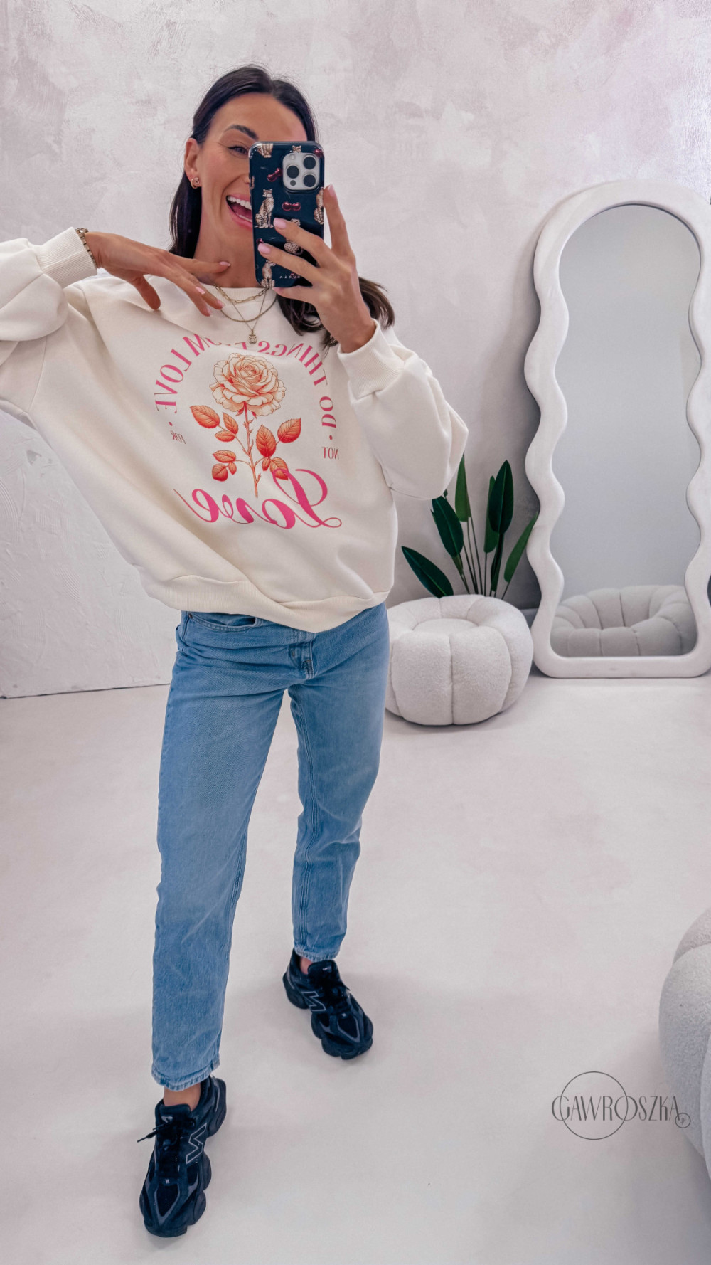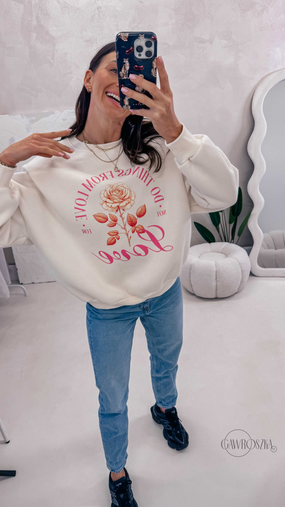 Delikatny print dodaje stylizacji lekkości i sprawia, że bluza świetnie komponuje się zarówno z jeansami, jak i bardziej casualowymi zestawami. Idealna na codzienne wyjścia, spacery i chwile tylko dla siebie.