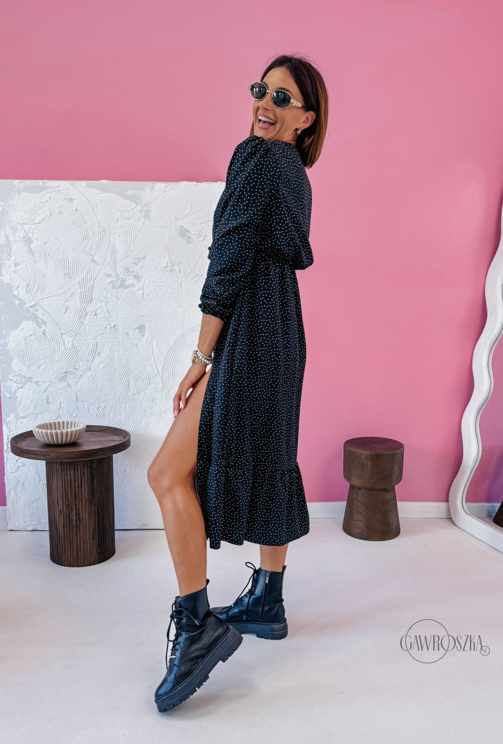 Sukienka midi Klara z długim rękawem - czarna w groszki