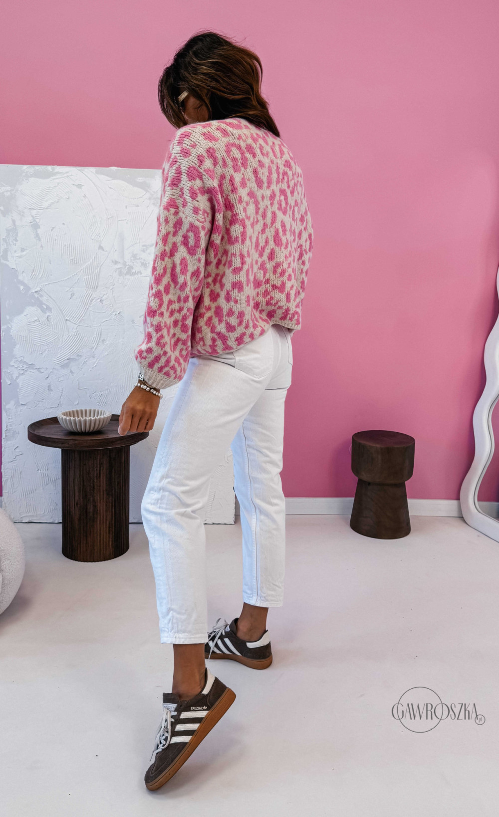 Niezwykle miękki kardigan w różową panterkę. Posiada charakterystyczny luźniejszy splot występujący miejscowo. Kardigan nie jest zapinany.