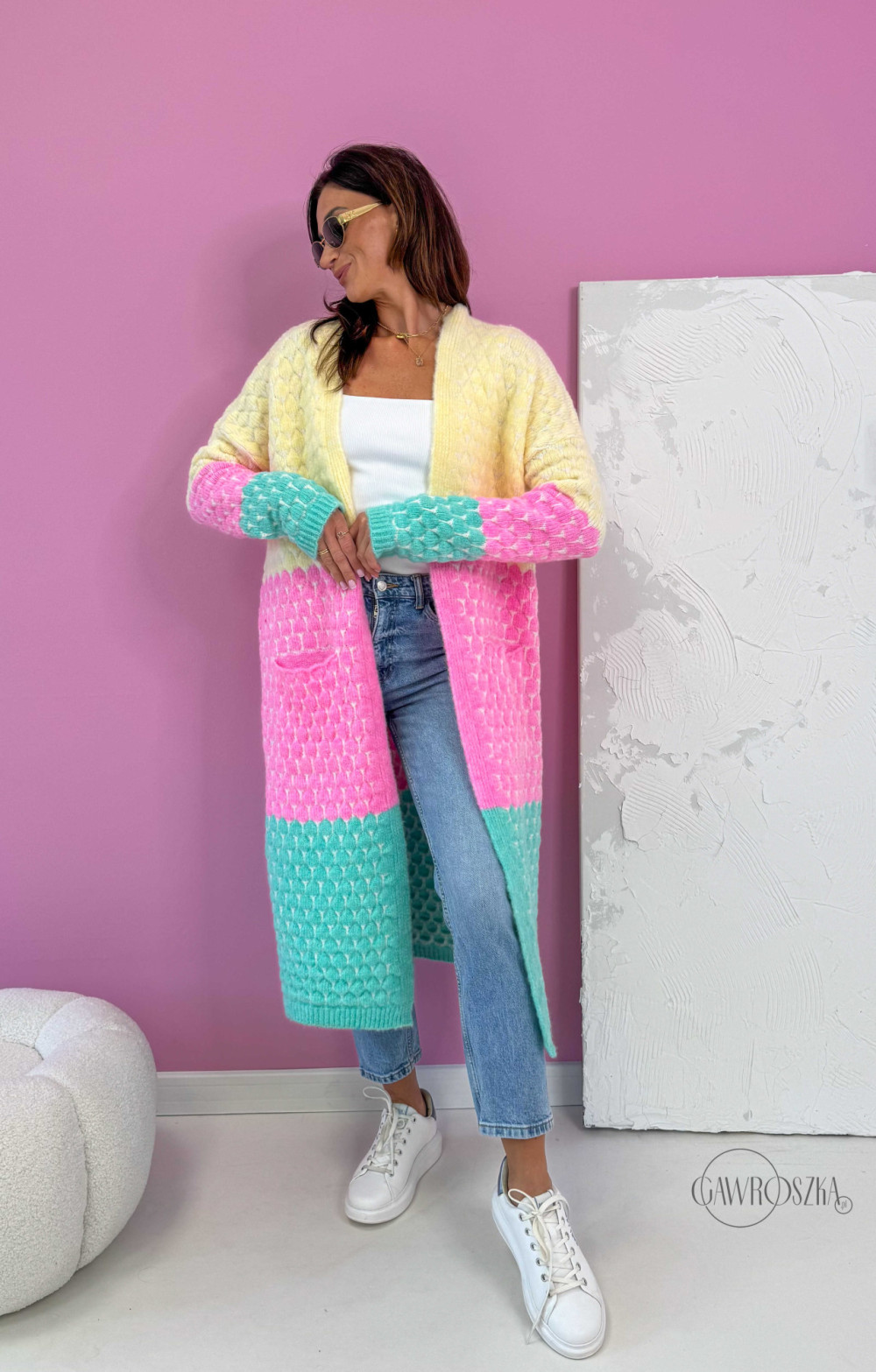 Długi kardigan z kieszeniami Becca - Wanilia-baby róż-seledyn